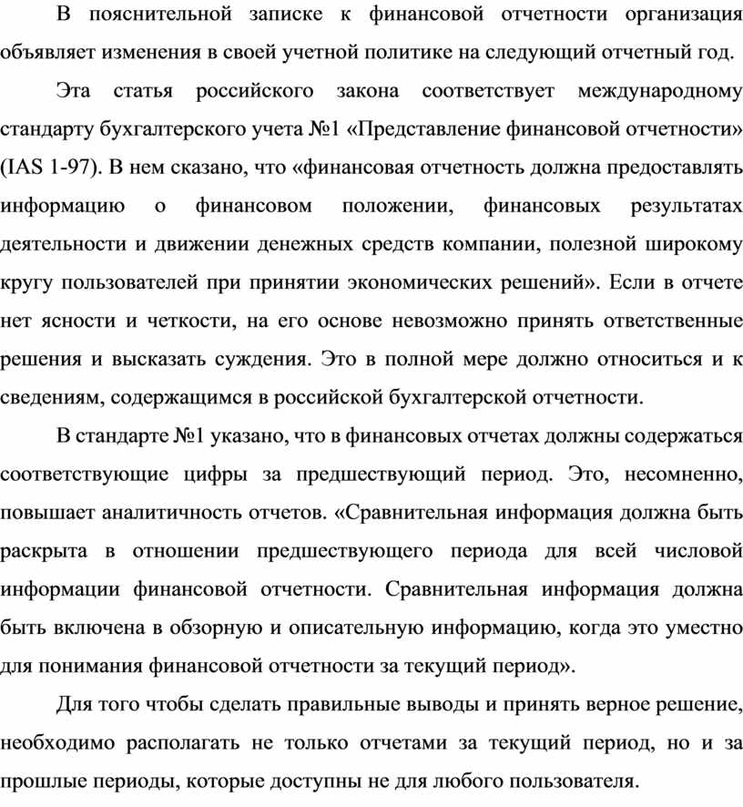 В стандарте №1 указано, что в финансовых отчетах должны содержаться соответствующие цифры за предшествующий период. Это, несомненно, повышает аналитичность отчетов. «Сравнительная информация должна быть раскрыта в отношении предшествующего периода для всей числовой информации финансовой отчетности. Сравнительная информация должна быть включена в обзорную и описательную информацию, когда это уместно для понимания финансовой отчетности за текущий период».