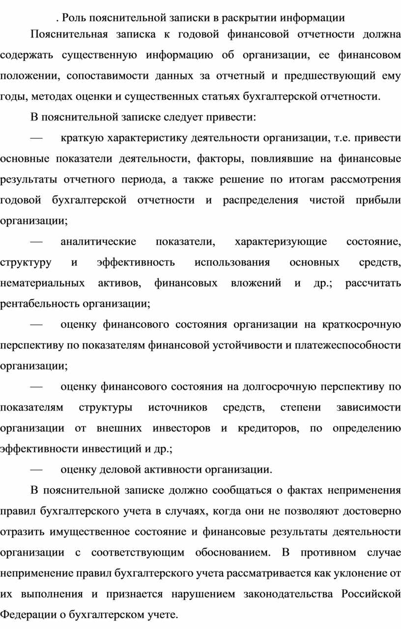 Пояснительная записка к годовой финансовой отчетности должна содержать существенную информацию об организации, ее финансовом положении, сопоставимости данных за отчетный и предшествующий ему годы, методах оценки и существенных статьях бухгалтерской отчетности.
