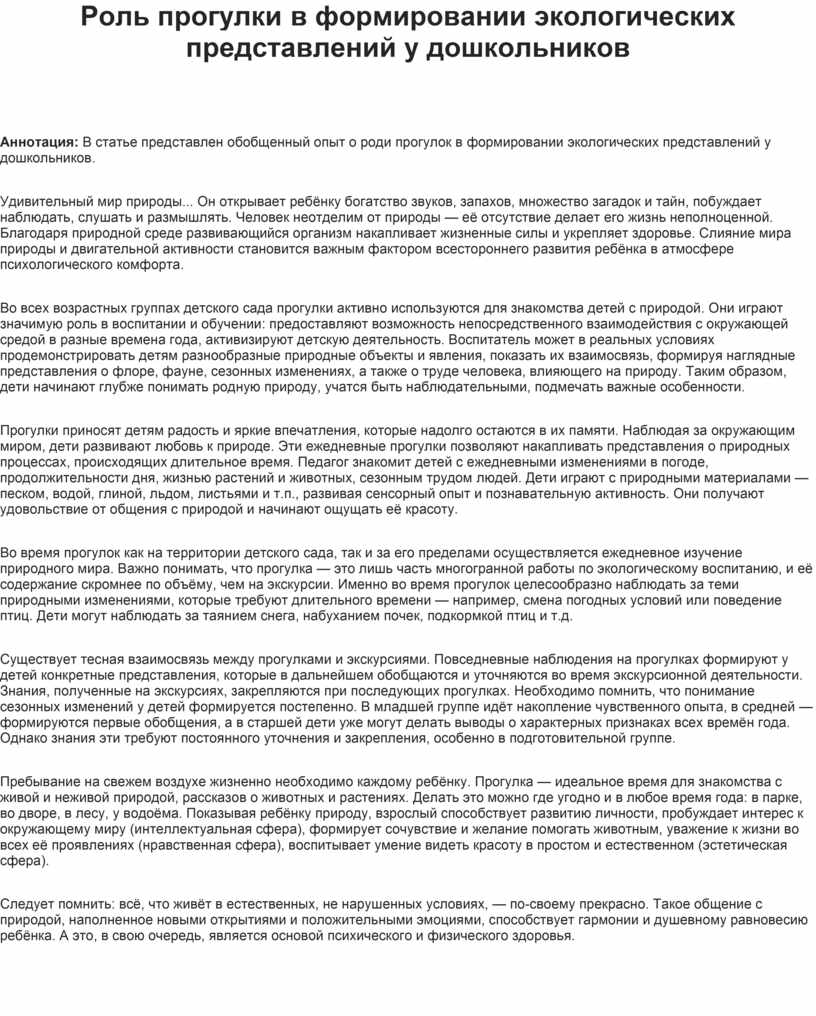 Аннотация: В статье представлен обобщенный опыт о роди прогулок в формировании экологических представлений у дошкольников.