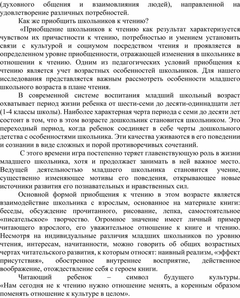 «Приобщение школьников к чтению как результат характеризуется чувством их причастности к чтению, потребностью и умением установить связи с культурой и социумом посредством чтения и проявляется в определенном уровне приобщенности, отражающей изменения в школьнике в отношении к чтению. Одним из педагогических условий приобщения к чтению является учет возрастных особенностей школьников. Для нашего исследования представляется важным рассмотреть особенности младшего школьного возраста в плане чтения.
