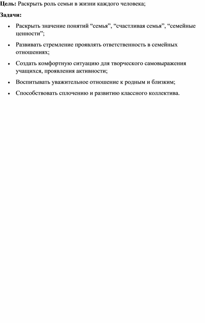 Цель: Раскрыть роль семьи в жизни каждого человека;
