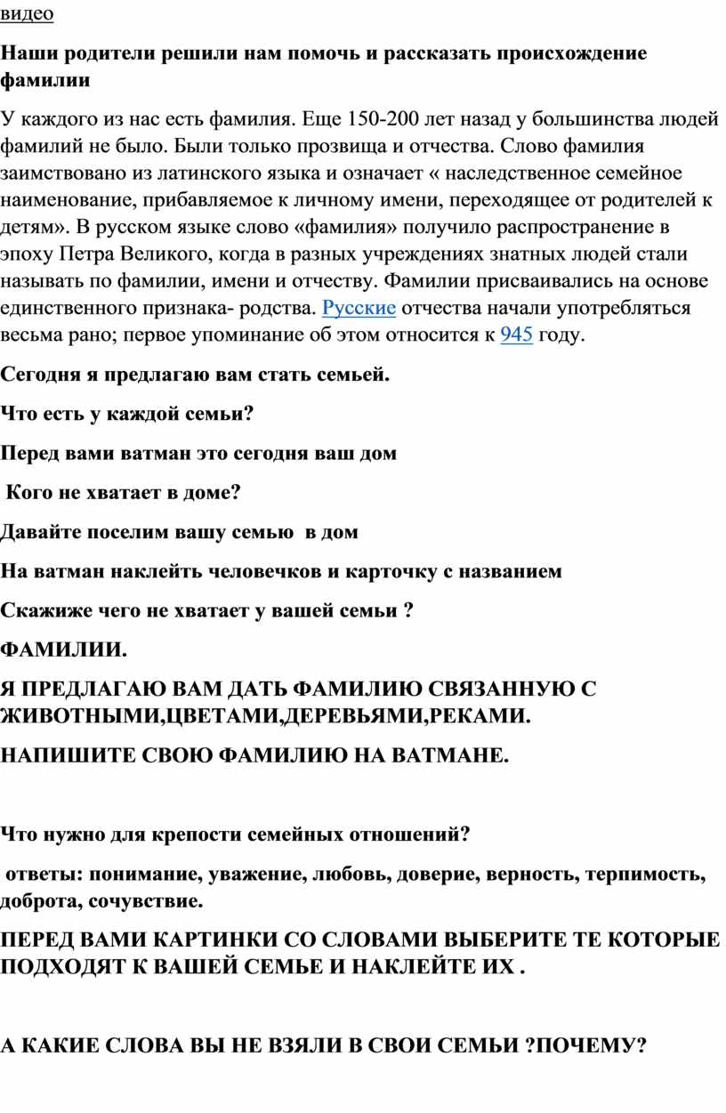 У каждого из нас есть фамилия. Еще 150-200 лет назад у большинства людей фамилий не было. Были только прозвища и отчества. Слово фамилия заимствовано из латинского языка и означает « наследственное семейное наименование, прибавляемое к личному имени, переходящее от родителей к детям». В русском языке слово «фамилия» получило распространение в эпоху Петра Великого, когда в разных учреждениях знатных людей стали называть по фамилии, имени и отчеству. Фамилии присваивались на основе единственного признака- родства. Русские отчества начали употребляться весьма рано; первое упоминание об этом относится к 945 году.