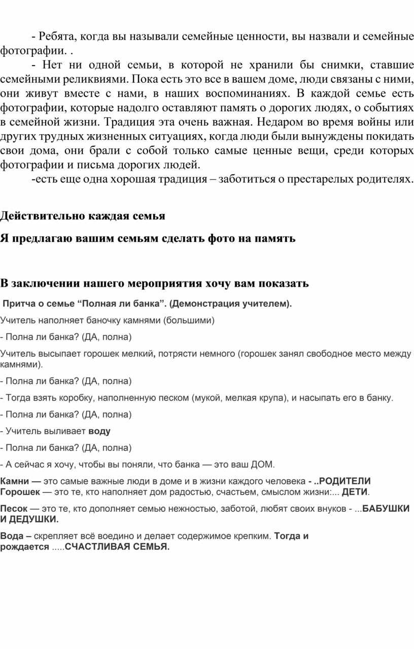 Притча о семье “Полная ли банка”. (Демонстрация учителем).