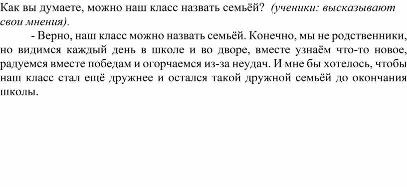 - Верно, наш класс можно назвать семьёй. Конечно, мы не родственники, но видимся каждый день в школе и во дворе, вместе узнаём что-то новое, радуемся вместе победам и огорчаемся из-за неудач. И мне бы хотелось, чтобы наш класс стал ещё дружнее и остался такой дружной семьёй до окончания школы.
