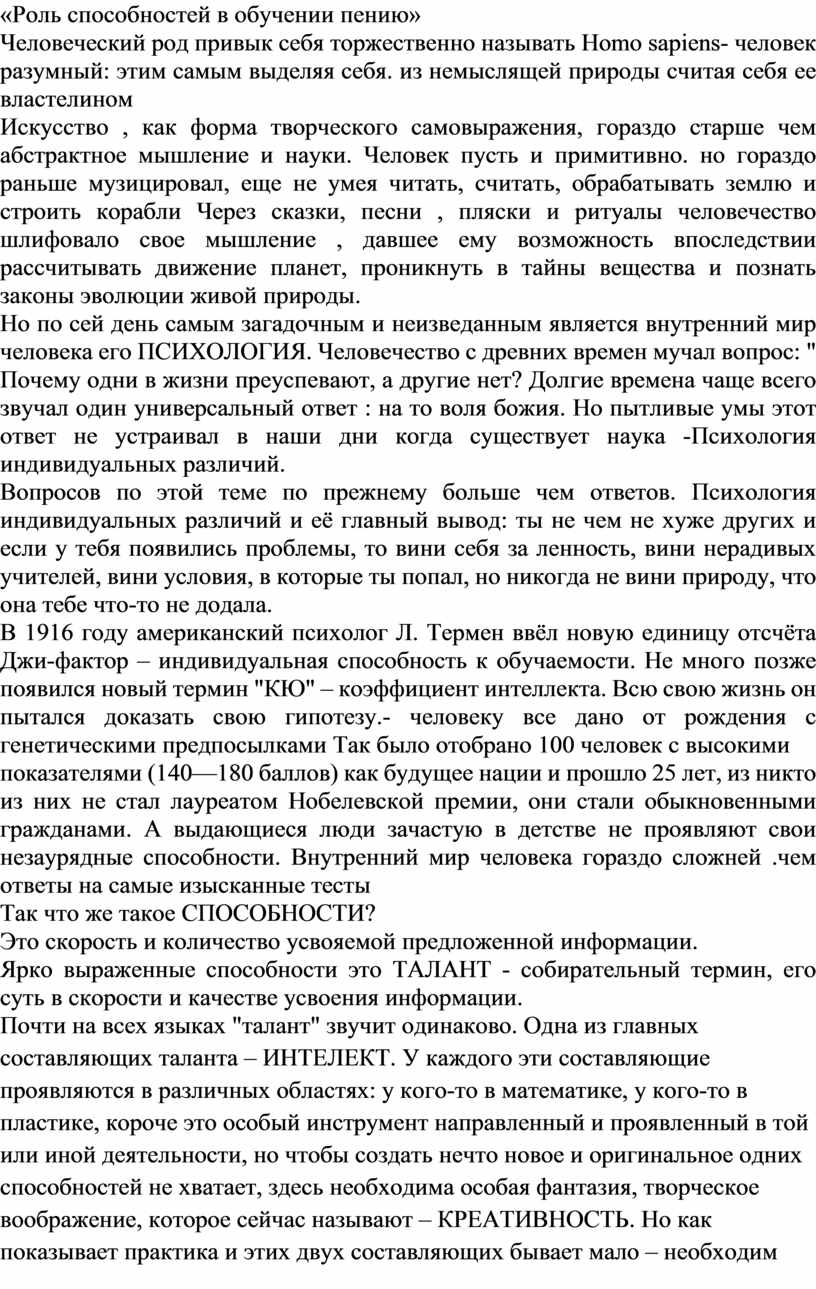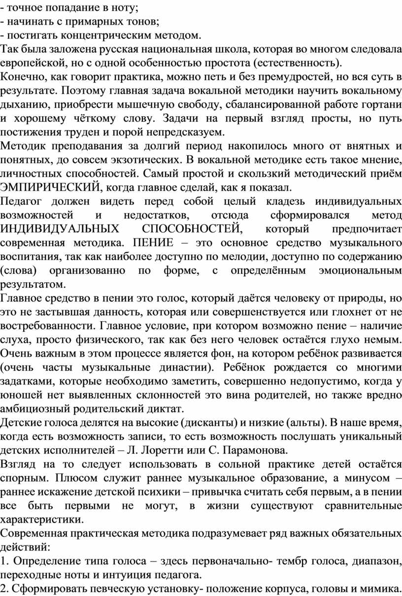 Педагог должен видеть перед собой целый кладезь индивидуальных возможностей и недостатков, отсюда сформировался метод ИНДИВИДУАЛЬНЫХ СПОСОБНОСТЕЙ, который предпочитает современная методика. ПЕНИЕ – это основное средство музыкального воспитания, так как наиболее доступно по мелодии, доступно по содержанию (слова) организованно по форме, с определённым эмоциональным результатом.