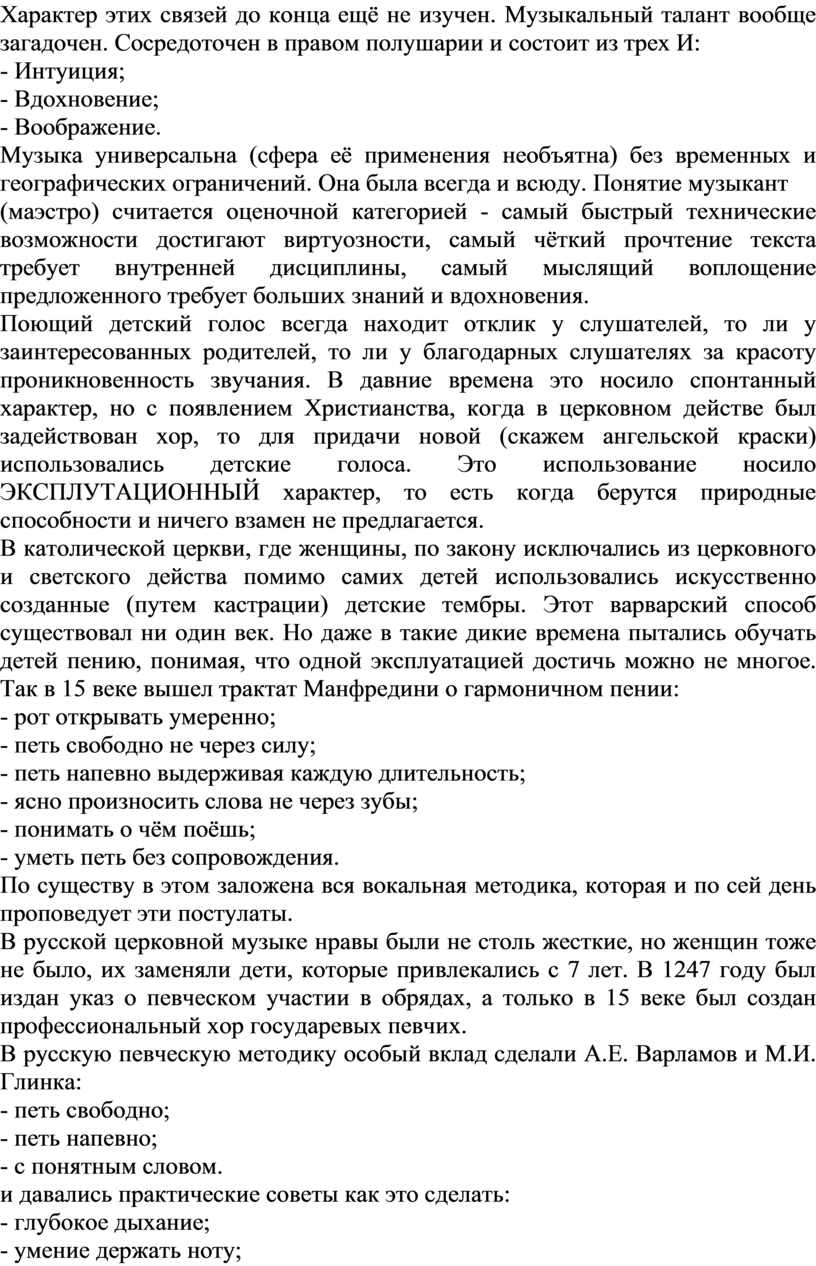 Поющий детский голос всегда находит отклик у слушателей, то ли у заинтересованных родителей, то ли у благодарных слушателях за красоту проникновенность звучания. В давние времена это носило спонтанный характер, но с появлением Христианства, когда в церковном действе был задействован хор, то для придачи новой (скажем ангельской краски) использовались детские голоса. Это использование носило ЭКСПЛУТАЦИОННЫЙ характер, то есть когда берутся природные способности и ничего взамен не предлагается.