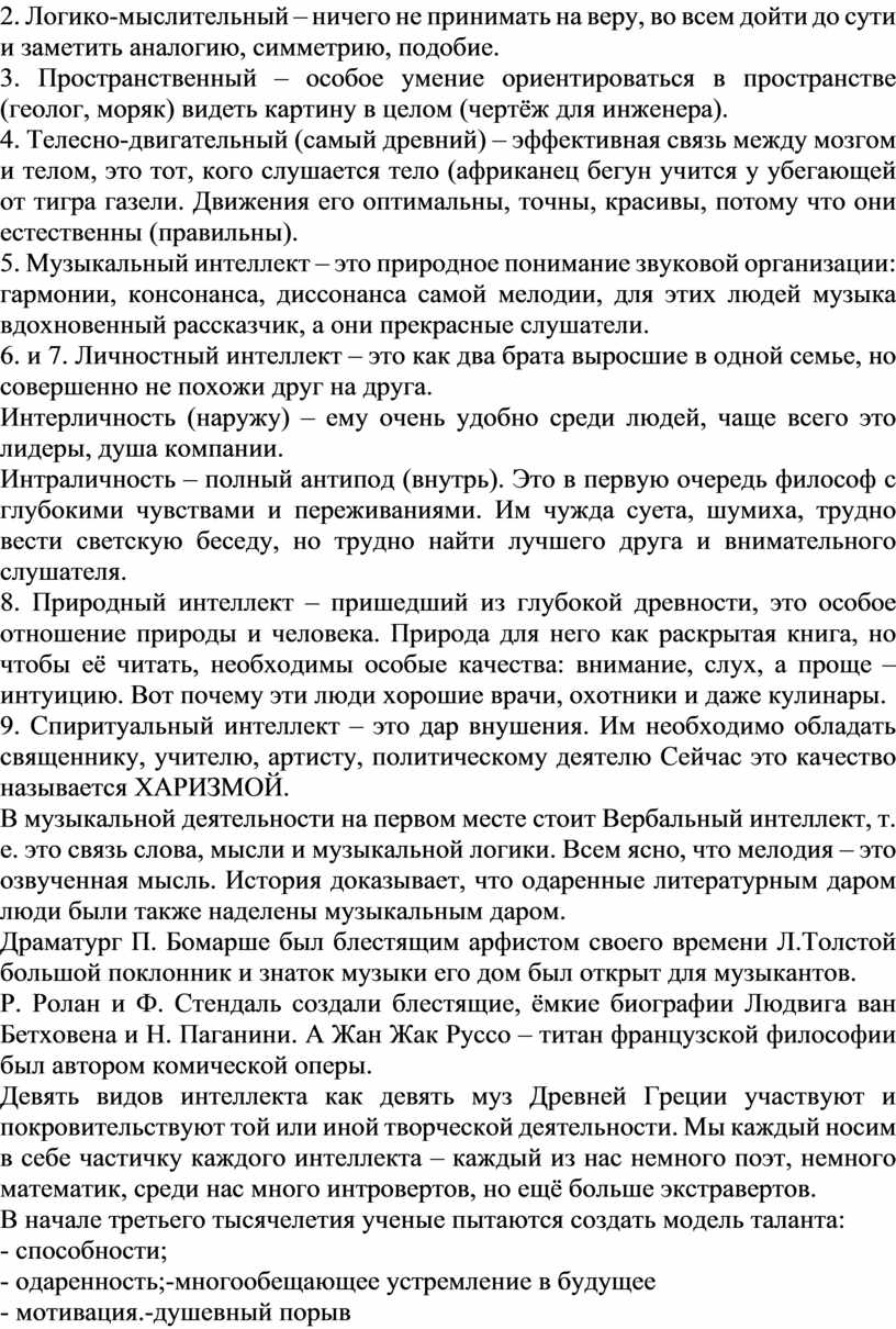 В музыкальной деятельности на первом месте стоит Вербальный интеллект, т. е. это связь слова, мысли и музыкальной логики. Всем ясно, что мелодия – это озвученная мысль. История доказывает, что одаренные литературным даром люди были также наделены музыкальным даром.