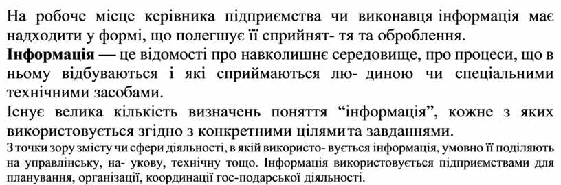 На робоче місце керівника підприємства чи виконавця інформація має надходити у формі, що полегшує її сприйнят- тя та оброблення.