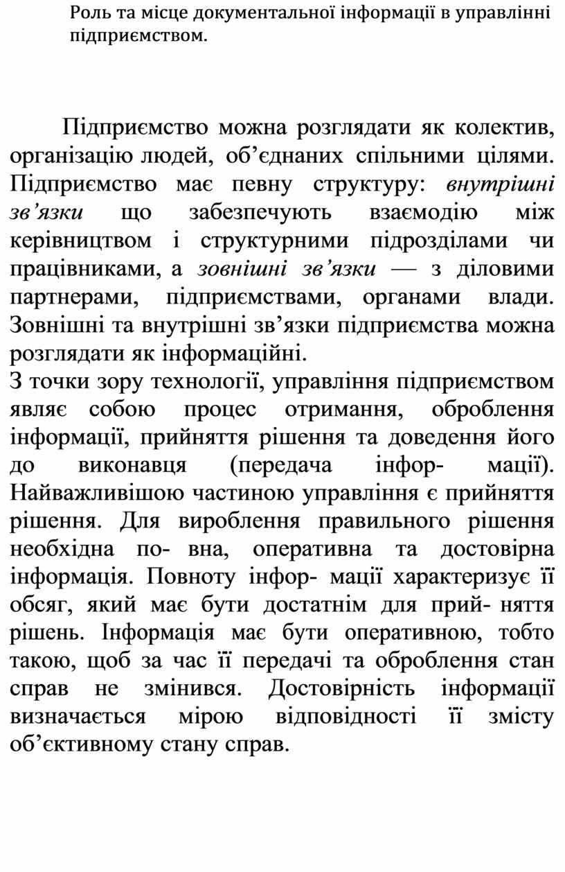 З точки зору технології, управління підприємством являє собою процес отримання, оброблення інформації, прийняття рішення та доведення його до виконавця (передача інфор- мації). Найважливішою частиною управління є прийняття рішення. Для вироблення правильного рішення необхідна по- вна, оперативна та достовірна інформація. Повноту інфор- мації характеризує її обсяг, який має бути достатнім для прий- няття рішень. Інформація має бути оперативною, тобто такою, щоб за час її передачі та оброблення стан справ не змінився. Достовірність інформації визначається мірою відповідності її змісту об’єктивному стану справ.