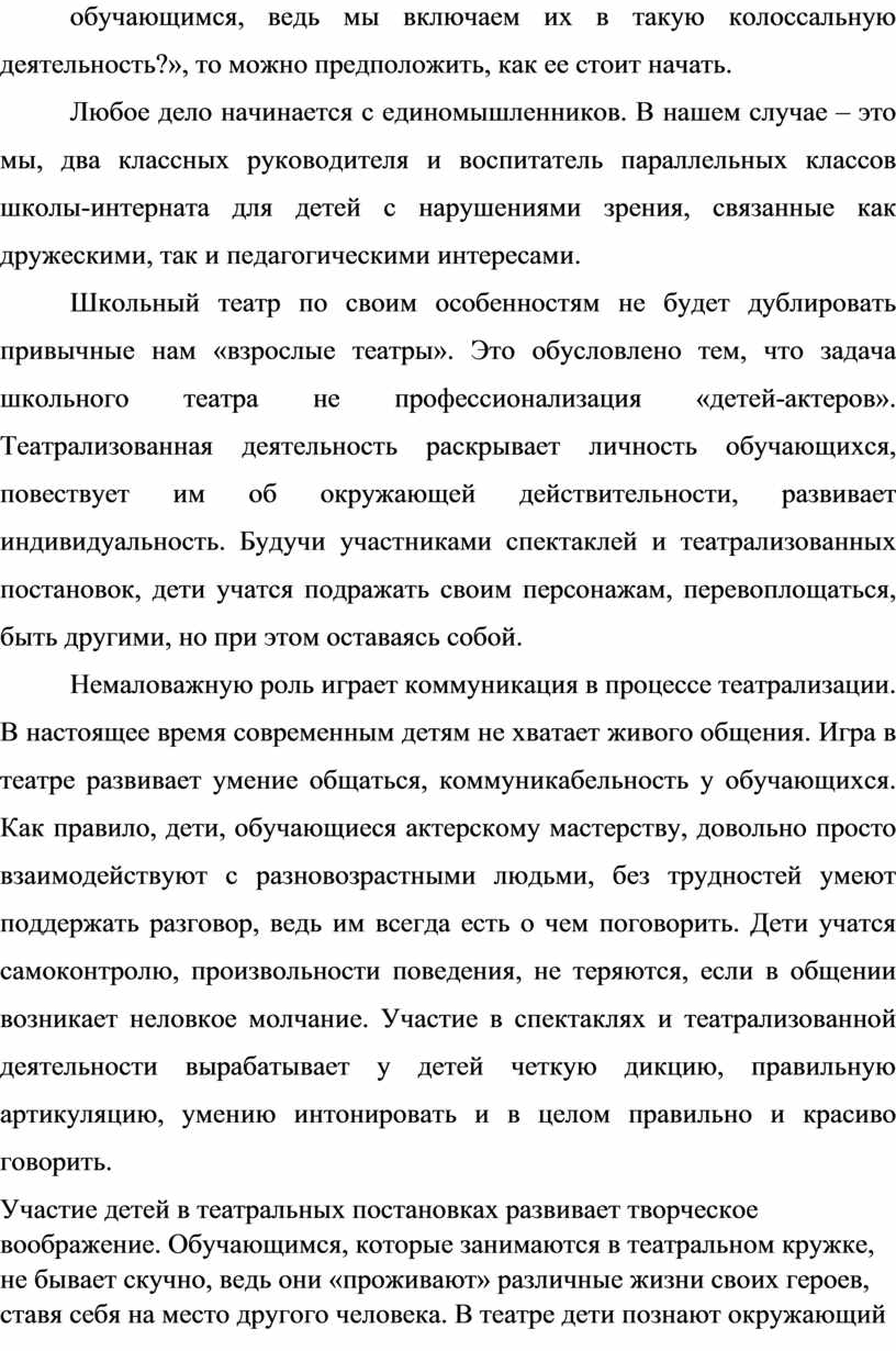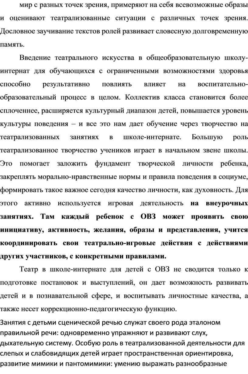 Введение театрального искусства в общеобразовательную школу-интернат для обучающихся с ограниченными возможностями здоровья способно результативно повлиять влияет на воспитательно-образовательный процесс в целом. Коллектив класса становится более сплоченнее, расширяется культурный диапазон детей, повышается уровень культуры поведения – и все это нам дает обучение через творчество на театрализованных занятиях в школе-интернате. Большую роль театрализованное творчество учеников играет в начальном звене школы. Это помогает заложить фундамент творческой личности ребенка, закреплять морально-нравственные нормы и правила поведения в социуме, формировать такое важное сегодня качество личности, как духовность. Для этого активно используется игровая деятельность на внеурочных занятиях. Там каждый ребенок с ОВЗ может проявить свою инициативу, активность, желания, образы и представления, учится координировать свои театрально-игровые действия с действиями других участников, с конкретными правилами.