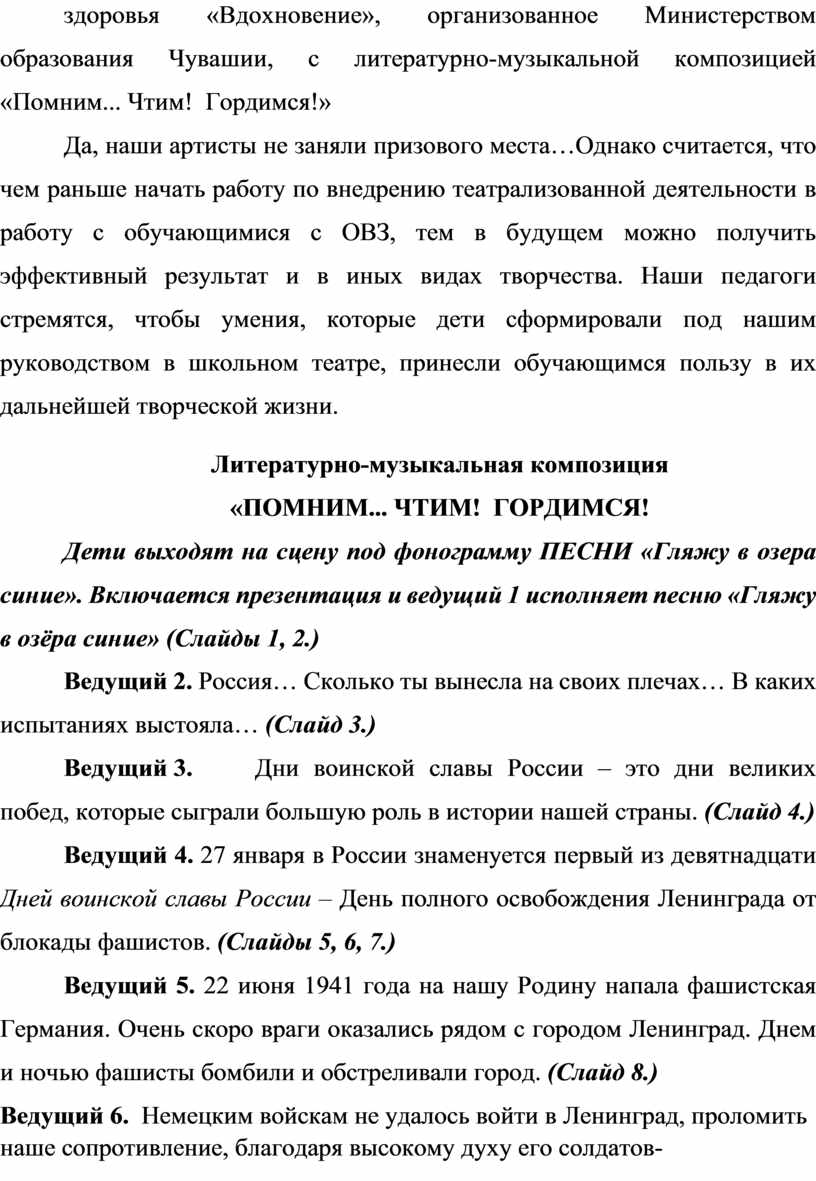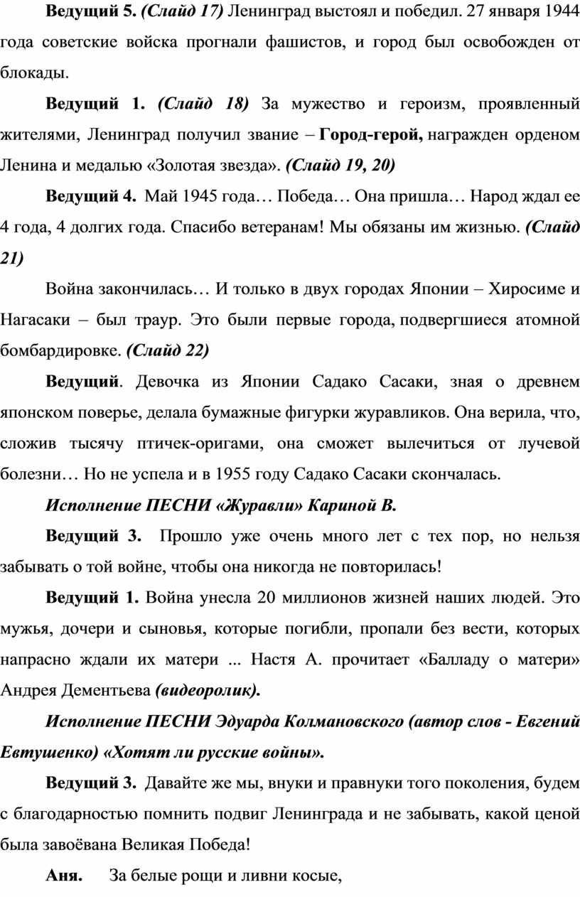 Ведущий 3. Давайте же мы, внуки и правнуки того поколения, будем с благодарностью помнить подвиг Ленинграда и не забывать, какой ценой была завоёвана Великая Победа!