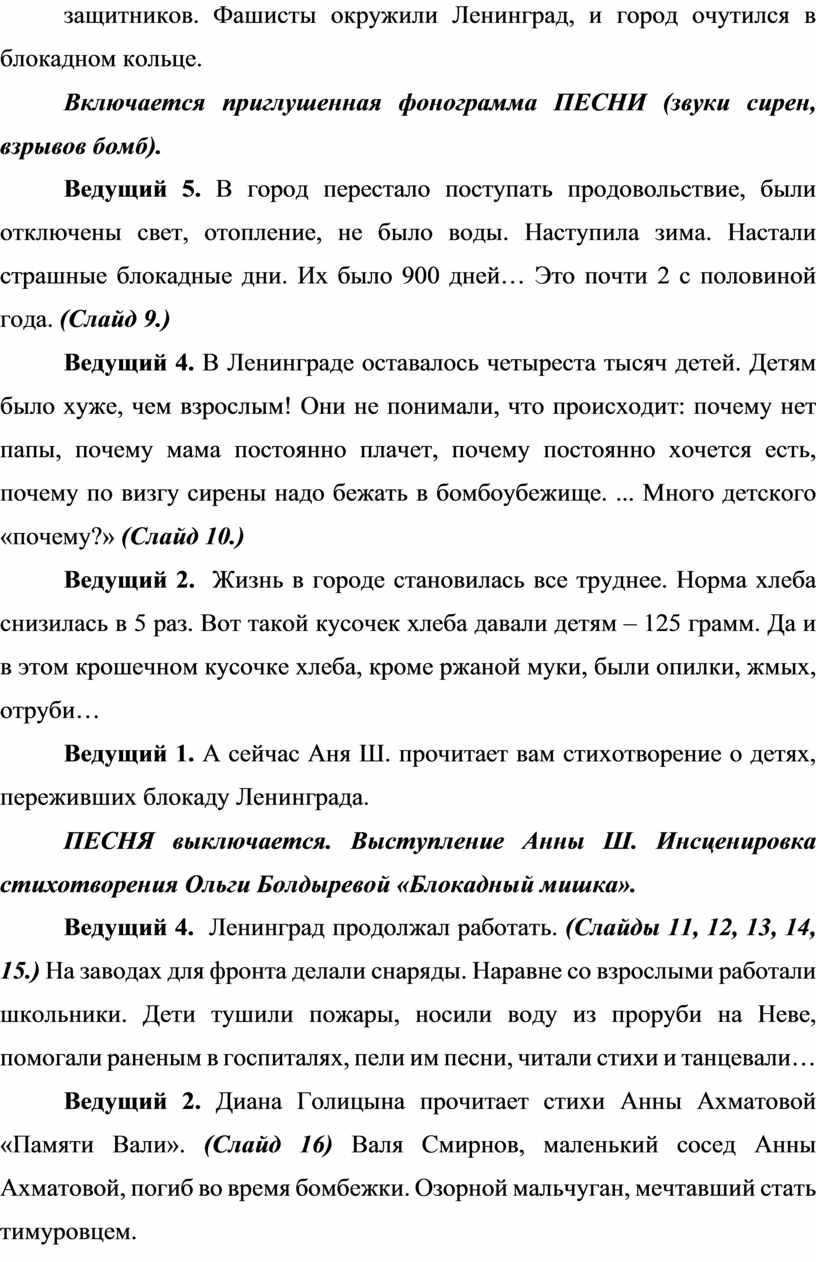 Ведущий 1. А сейчас Аня Ш. прочитает вам стихотворение о детях, переживших блокаду Ленинграда.