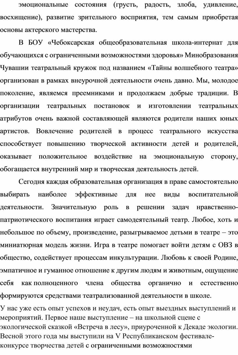 В БОУ «Чебоксарская общеобразовательная школа-интернат для обучающихся с ограниченными возможностями здоровья» Минобразования Чувашии театральный кружок под названием «Тайны волшебного театра» организован в рамках внеурочной деятельности очень давно. Мы, молодое поколение, являемся преемниками и продолжаем добрые традиции. В организации театральных постановок и изготовлении театральных атрибутов очень важной составляющей являются родители наших юных артистов. Вовлечение родителей в процесс театрального искусства способствует повышению творческой активности детей и родителей, оказывает положительное воздействие на эмоциональную сторону, обогащается внутренний мир и творческая деятельность детей.