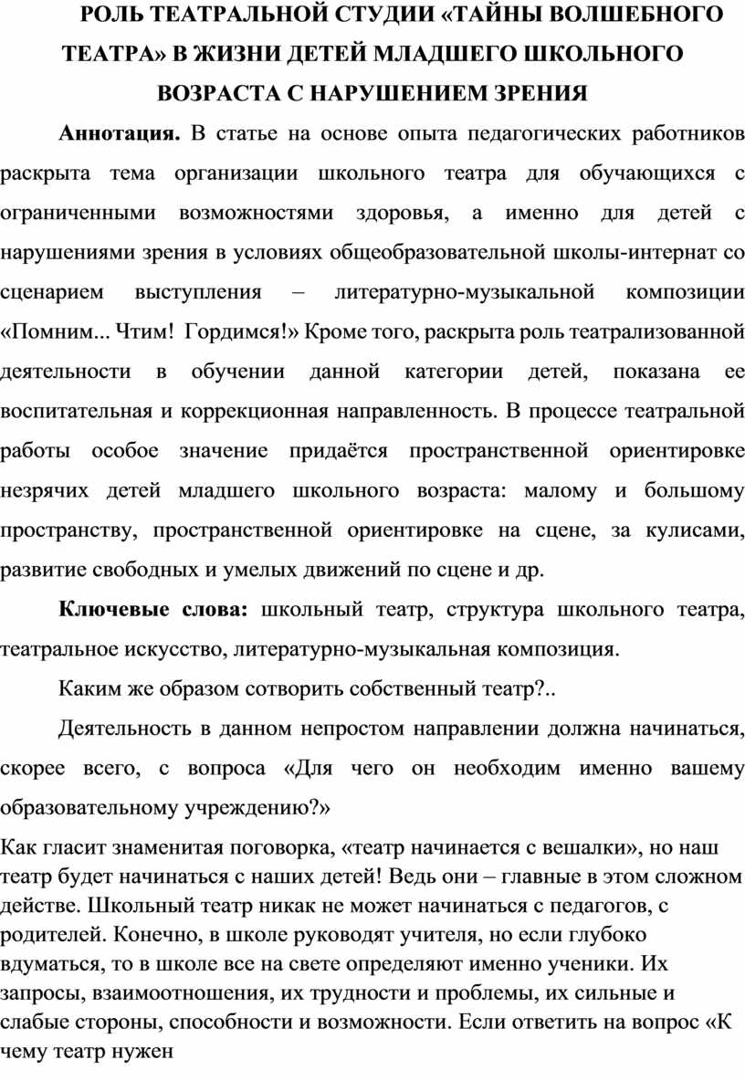 Аннотация. В статье на основе опыта педагогических работников раскрыта тема организации школьного театра для обучающихся с ограниченными возможностями здоровья, а именно для детей с нарушениями зрения в условиях общеобразовательной школы-интернат со сценарием выступления – литературно-музыкальной композиции «Помним... Чтим! Гордимся!» Кроме того, раскрыта роль театрализованной деятельности в обучении данной категории детей, показана ее воспитательная и коррекционная направленность. В процессе театральной работы особое значение придаётся пространственной ориентировке незрячих детей младшего школьного возраста: малому и большому пространству, пространственной ориентировке на сцене, за кулисами, развитие свободных и умелых движений по сцене и др.