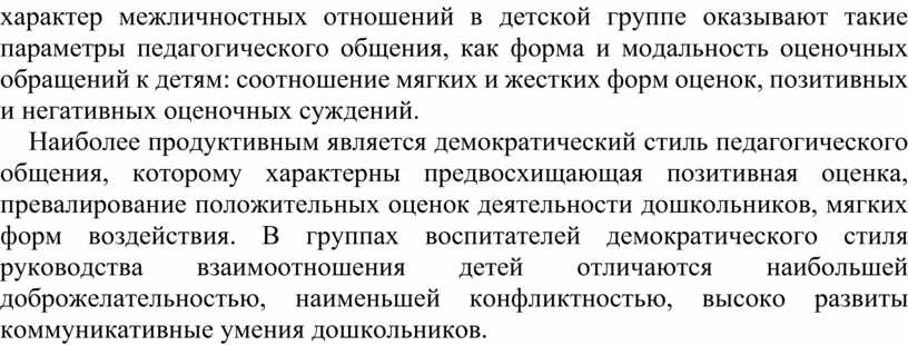 Значим и стиль педагогического общения (авторитарный, либеральный, демократический). Ученые обнаружили, что наиболее сильное влияние на характер межличностных отношений в детской группе оказывают такие параметры педагогического общения, как форма и модальность оценочных обращений к детям: соотношение мягких и жестких форм оценок, позитивных и негативных оценочных суждений.
