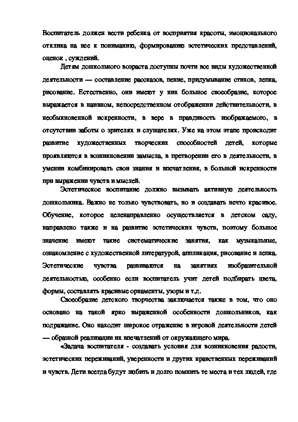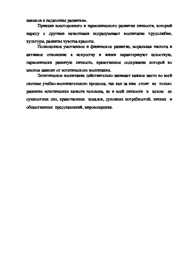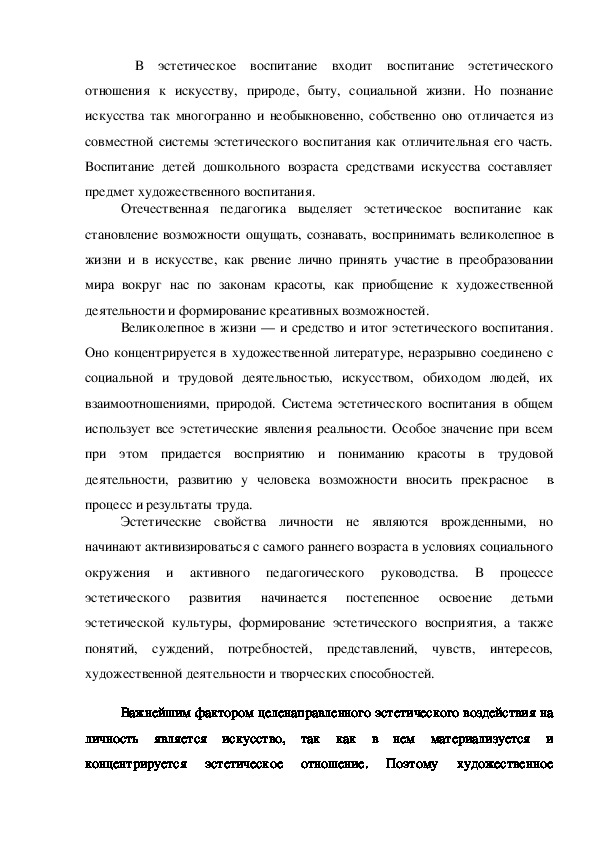 Каждый человек должен быть всесторонне развитым. Поэтому, в педагогике, на ряду с многими направления воспитания, не маловажную роль уделяется и эстетическому воспитанию. Мы считаем, что эстетическое воспитание помогает ребенку лучше понимать прелести природы, живописи, музыки, танца и т.д. Эстетически воспитанный человек умеет тонко чувствовать любые произведения искусства и т.д.Каждый человек должен быть всесторонне развитым. Поэтому, в педагогике, на ряду с многими направления воспитания, не маловажную роль уделяется и эстетическому воспитанию. Мы считаем, что эстетическое воспитание помогает ребенку лучше понимать прелести природы, живописи, музыки, танца и т.д. Эстетически воспитанный человек умеет тонко чувствовать любые произведения искусства и т.д.