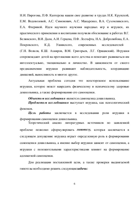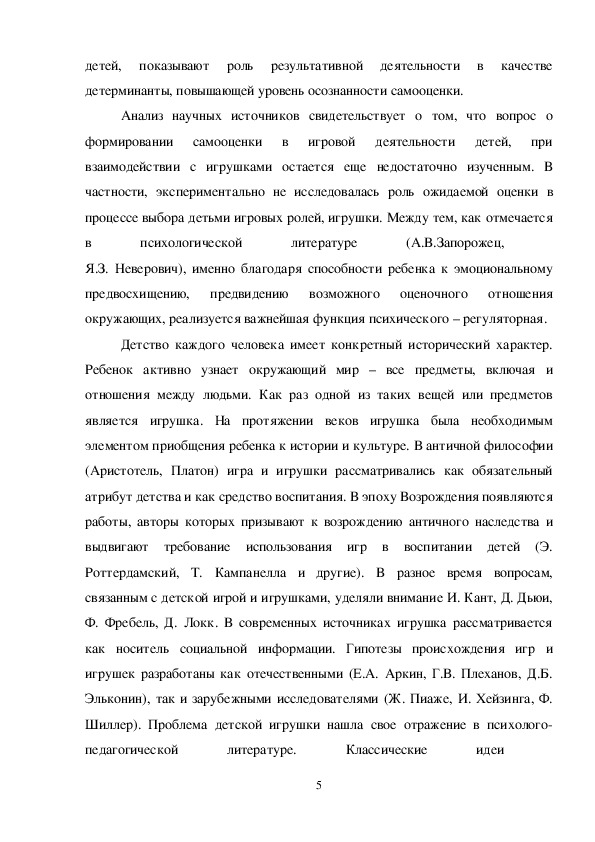 Детство каждого человека имеет конкретный исторический характер. Ребенок активно узнает окружающий мир – все предметы, включая и отношения между людьми. Как раз одной из таких вещей или предметов является игрушка. В эпоху Возрождения появляются работы, авторы которых призывают к возрождению античного наследства и выдвигают требование использования игр в воспитании детей. В разное время вопросам, связанным с детской игрой и игрушками, уделяли внимание И. Кант, Д. Дьюи, Ф. Фребель, Д. Локк. В современных источниках игрушка рассматривается как носитель социальной информации. Гипотезы происхождения игр и игрушек разработаны как отечественными, так и зарубежными исследователями. Проблема детской игрушки нашла свое отражение в психолого-педагогической литературе. Классические идеи Н.И. Пирогова, П.Ф. Каптерева нашли свое развитие в трудах Н.К. Крупской, Е.М. Водовозовой, А.С. Макаренко и др. Игрушки сопровождают детей на протяжении всего детства и помогают развиваться им интеллектуально, эмоционально и личностно. В зависимости от своего предназначения игрушки развивают наблюдательность, координацию движений, выносливость и многое другое. Актуальная проблема сегодня это неосторожное использование игрушки, которое может навредить физическому и психическому здоровью дошкольника, а также формированию его самооценки.