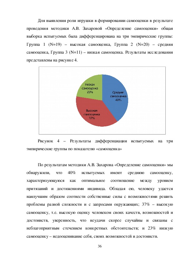 обнаружили, что 40% испытуемых имеют среднюю самооценку, 37% –