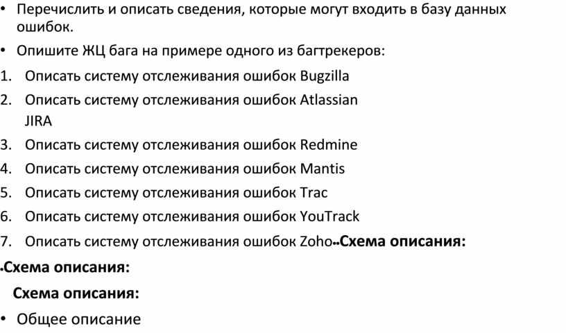 • Перечислить и описать сведения, которые могут входить в базу данных ошибок. • Опишите ЖЦ бага на примере одного из багтрекеров: 1. Описать систему отслеживания ошибок Bugzilla 2. Описать систему отслеживания ошибок Atlassian JIRA 3. Описать систему отслеживания ошибок Redmine 4. Описать систему отслеживания ошибок Mantis 5. Описать систему отслеживания ошибок Trac 6. Описать систему отслеживания ошибок YouTrack 7. Описать систему отслеживания ошибок Zoho |