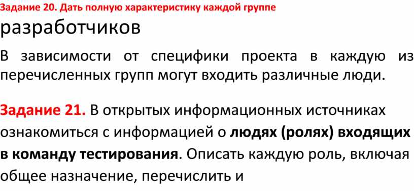 Задание 21. В открытых информационных источниках ознакомиться с информацией о людях (ролях) входящих в команду тестирования. Описать каждую роль, включая общее назначение, перечислить и охарактеризовать выполняемые функции, виды задач и работ, входные выходные данные.