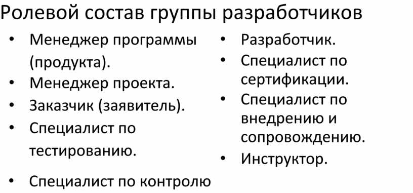 • Менеджер программы (продукта). • Менеджер проекта. • Заказчик (заявитель). • Специалист по тестированию. |
