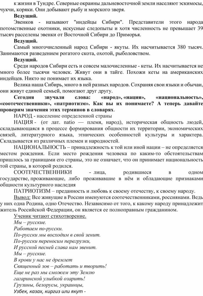 Вывод: Все живущие в России именуются соотечественниками, россиянами. Ведь у них одна Родина, одно Отечество. Независимо от того, к какому народу принадлежит житель Российской Федерации, он является ее полноправным гражданином.