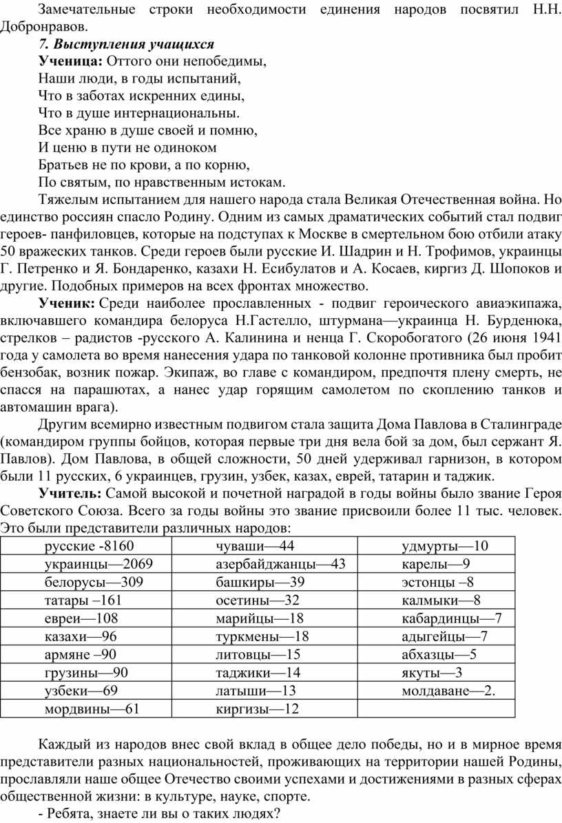 Ученик: Среди наиболее прославленных - подвиг героического авиаэкипажа, включавшего командира белоруса Н.Гастелло, штурмана—украинца Н. Бурденюка, стрелков – радистов -русского А. Калинина и ненца Г. Скоробогатого (26 июня 1941 года у самолета во время нанесения удара по танковой колонне противника был пробит бензобак, возник пожар. Экипаж, во главе с командиром, предпочтя плену смерть, не спасся на парашютах, а нанес удар горящим самолетом по скоплению танков и автомашин врага).