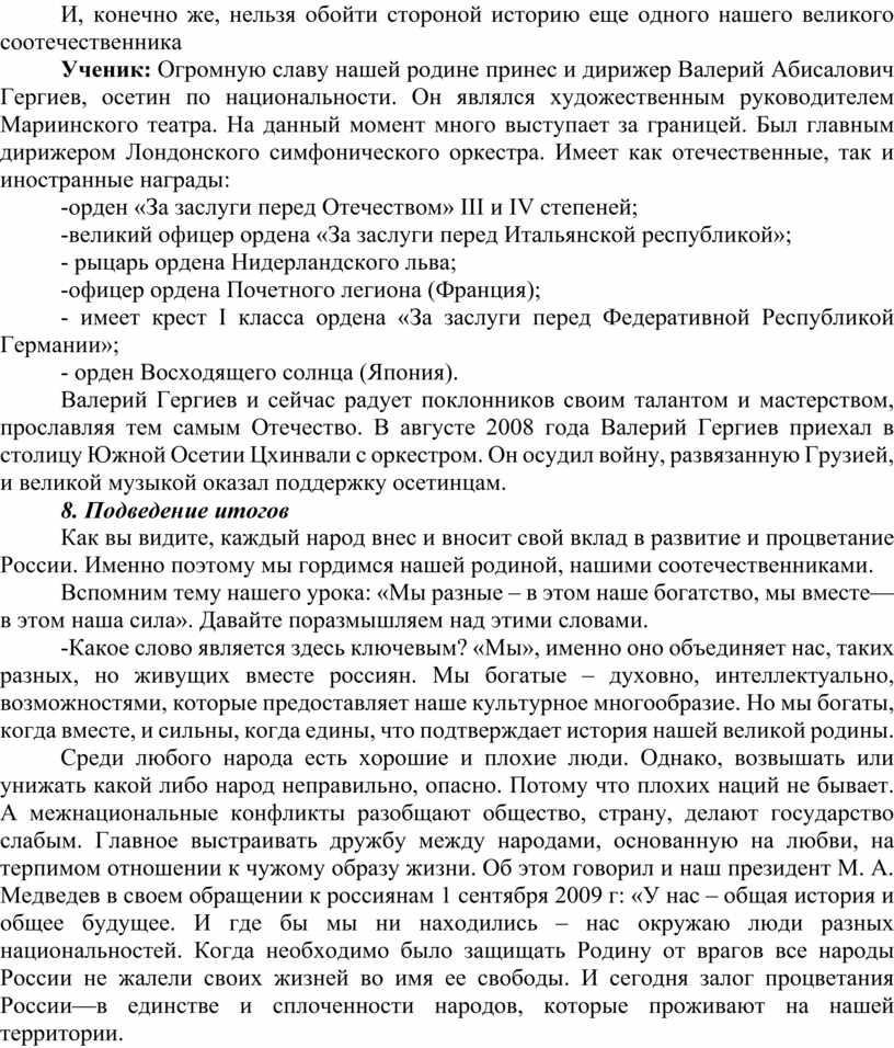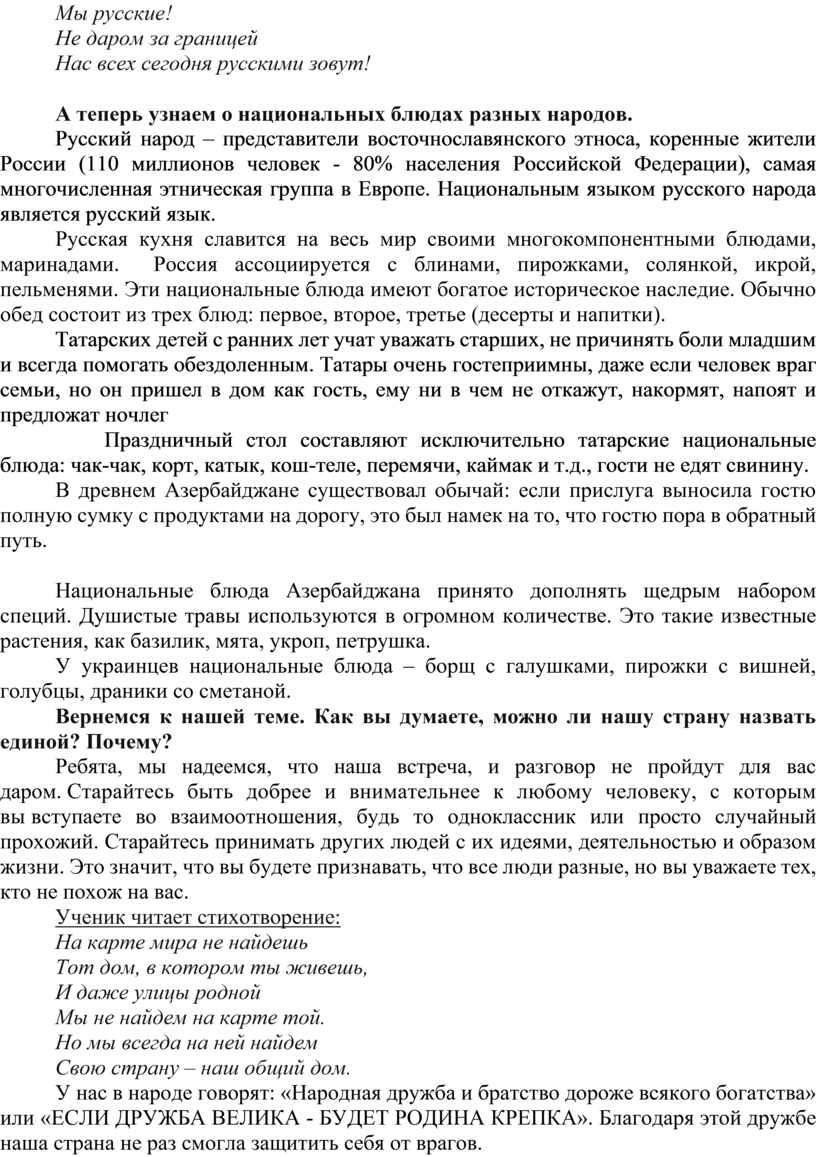 Среди любого народа есть хорошие и плохие люди. Однако, возвышать или унижать какой либо народ неправильно, опасно. Потому что плохих наций не бывает. А межнациональные конфликты разобщают общество, страну, делают государство слабым. Главное выстраивать дружбу между народами, основанную на любви, на терпимом отношении к чужому образу жизни. Об этом говорил и наш президент М. А. Медведев в своем обращении к россиянам 1 сентября 2009 г: «У нас – общая история и общее будущее. И где бы мы ни находились – нас окружаю люди разных национальностей. Когда необходимо было защищать Родину от врагов все народы России не жалели своих жизней во имя ее свободы. И сегодня залог процветания России—в единстве и сплоченности народов, которые проживают на нашей территории.