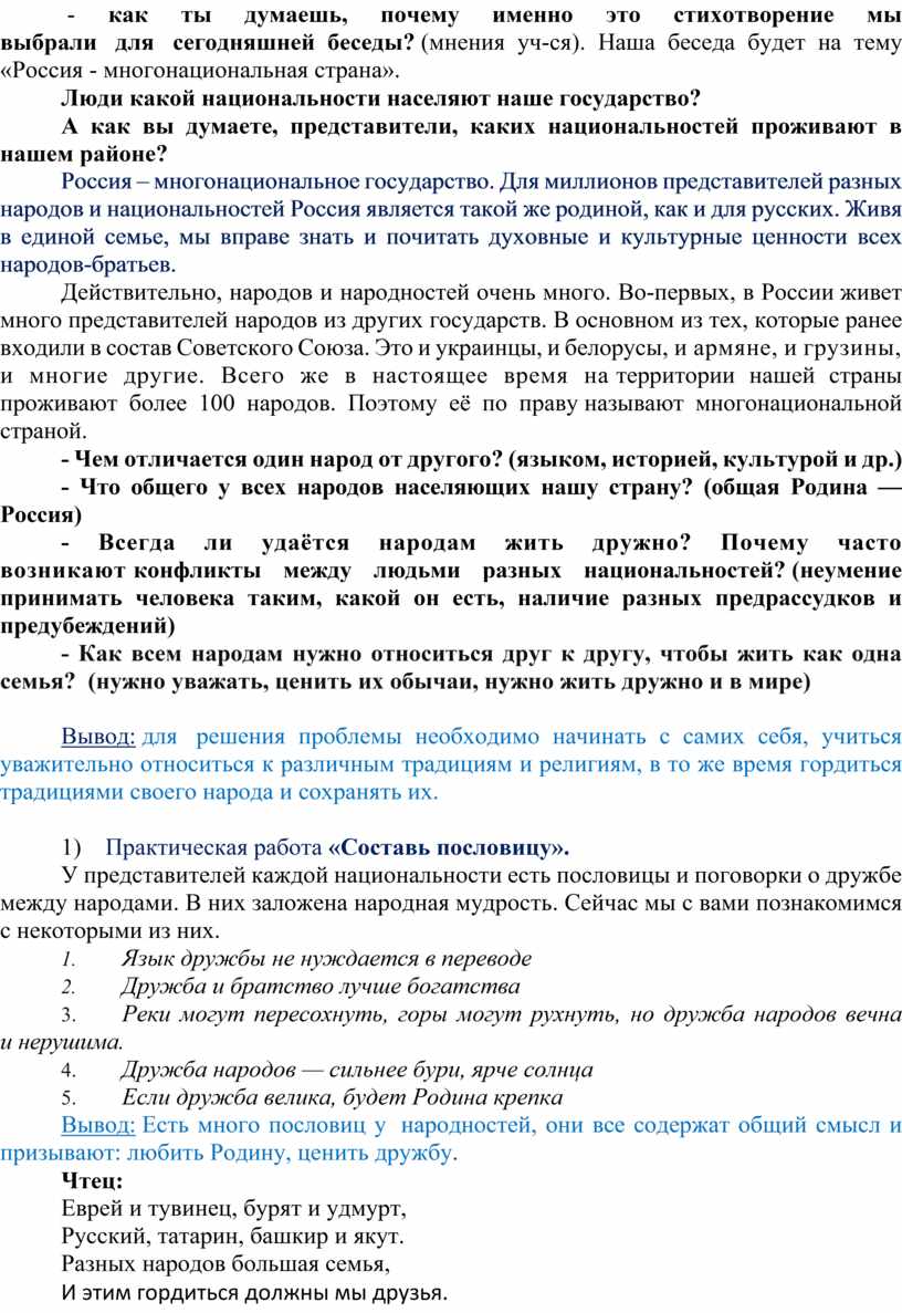 - Всегда ли удаётся народам жить дружно? Почему часто возникают конфликты между людьми разных национальностей? (неумение принимать человека таким, какой он есть, наличие разных предрассудков и предубеждений)