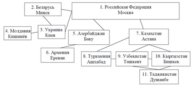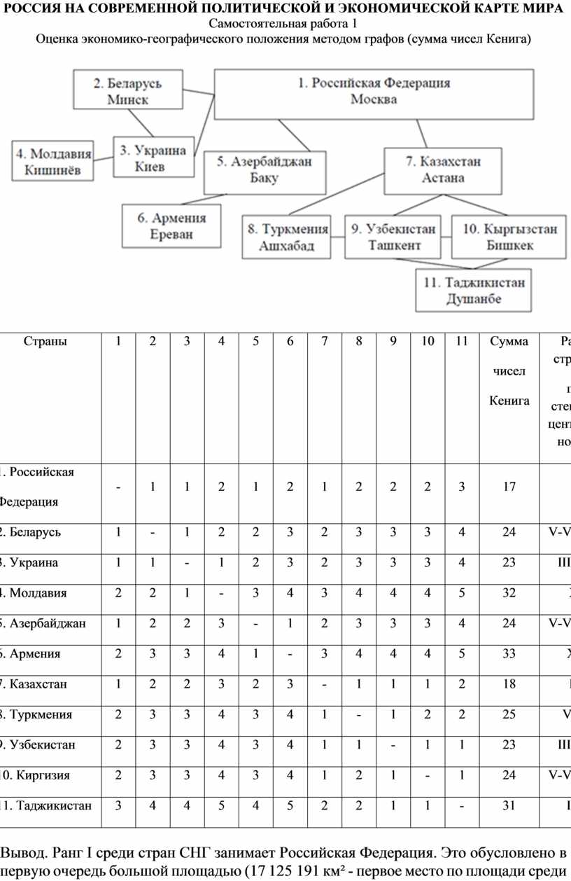 Вывод. Ранг I среди стран СНГ занимает Российская Федерация. Это обусловлено в первую очередь большой площадью (17 125 191 км² - первое место по площади среди стран мира) и протяженными границами (самая протяжённая береговая линия в мире - 37 653 км). Благодаря такому географическому положению Россия имеет непосредственную границу с 4 странами СНГ, все остальные страны СНГ, кроме Таджикистана, находятся от России на расстоянии двух графов.