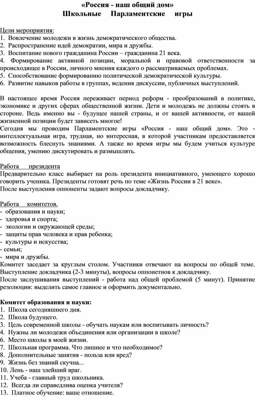 Сегодня мы проводим Парламентские игры «Россия - наш общий дом». Это - интеллектуальная игра, трудная, но интересная, в которой участникам предоставляется возможность блеснуть знаниями. А также во время игры мы будем учиться культуре общения, умению дискутировать и размышлять.