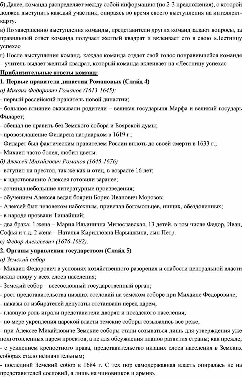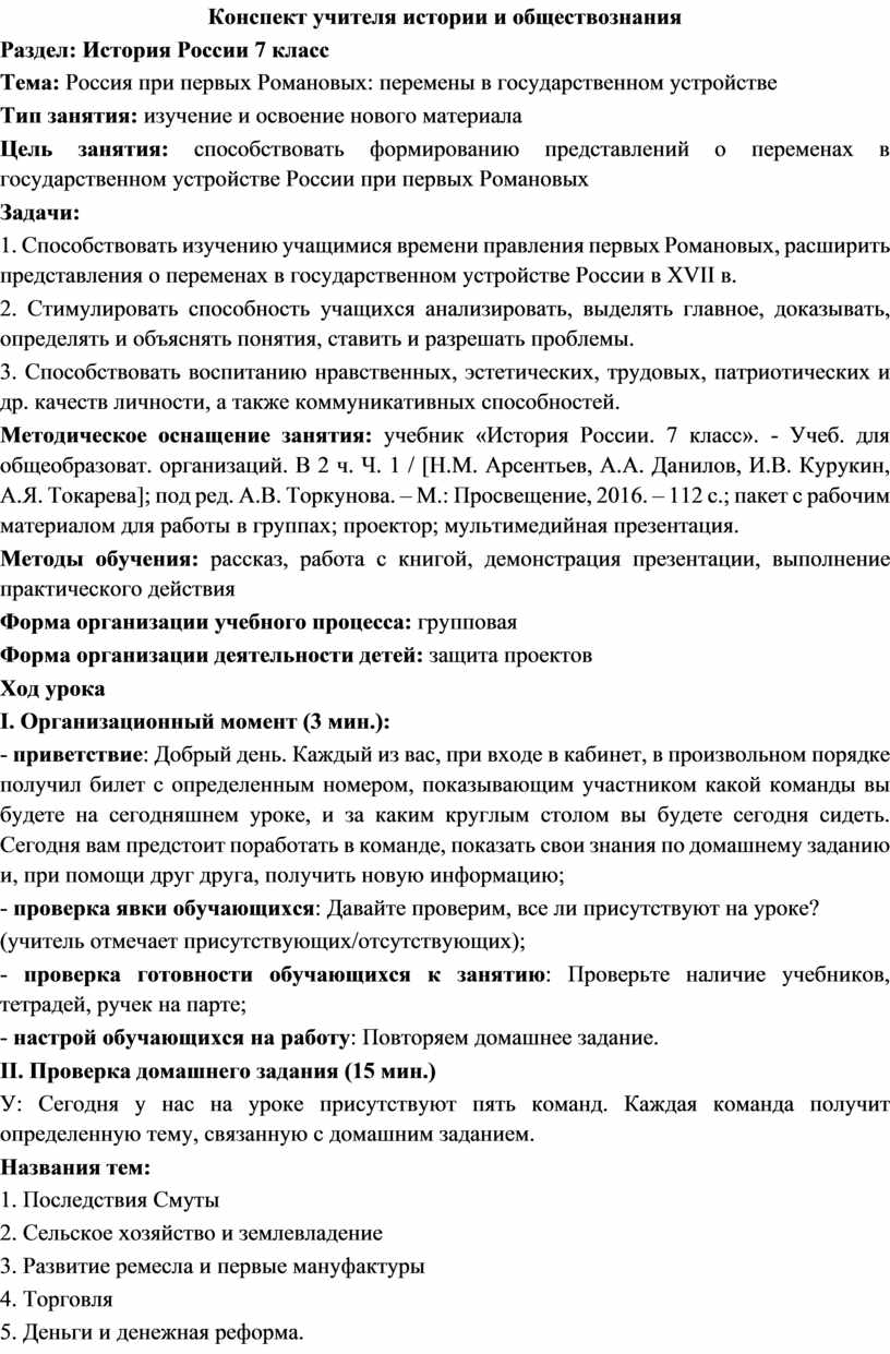 1. Способствовать изучению учащимися времени правления первых Романовых, расширить представления о переменах в государственном устройстве России в XVII в.