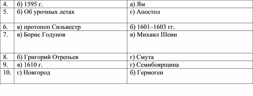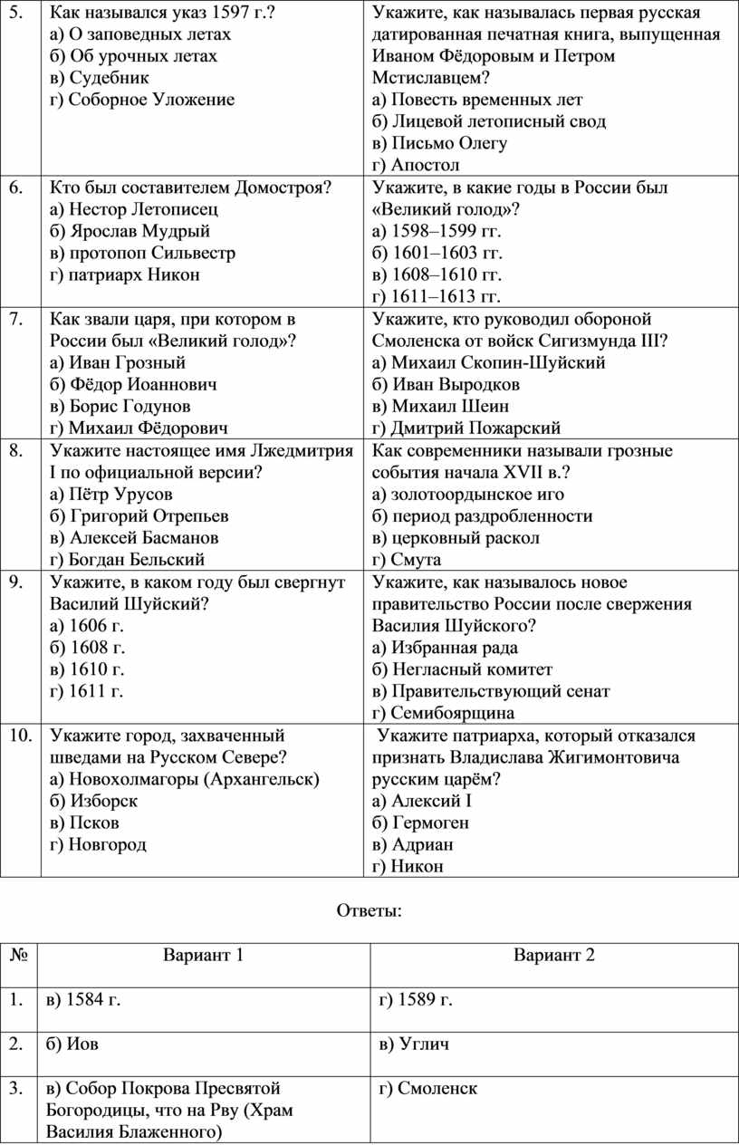 Тест по истории на тему: «Россия при царе Фёдоре Иоанновиче. Развитие культуры в XVI в. Духовная жизнь общества в XVI в. В преддверии грозных испытаний: кризис власти и общества на рубеже XVI–XVII вв. Начало Смуты. Самозванец на троне. Апогей Смуты. «Всеконечное разорение»