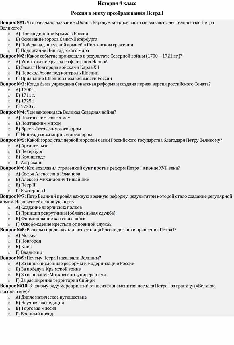 Вопрос №8: В каком городе находилась столица России до эпохи правления Петра I?