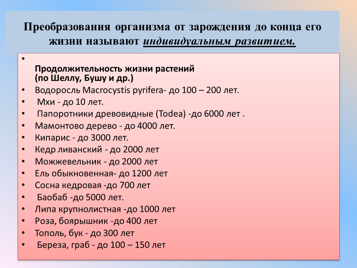 Преобразования организма от зарождения до конца его жизни называют индивидуальным развитием.