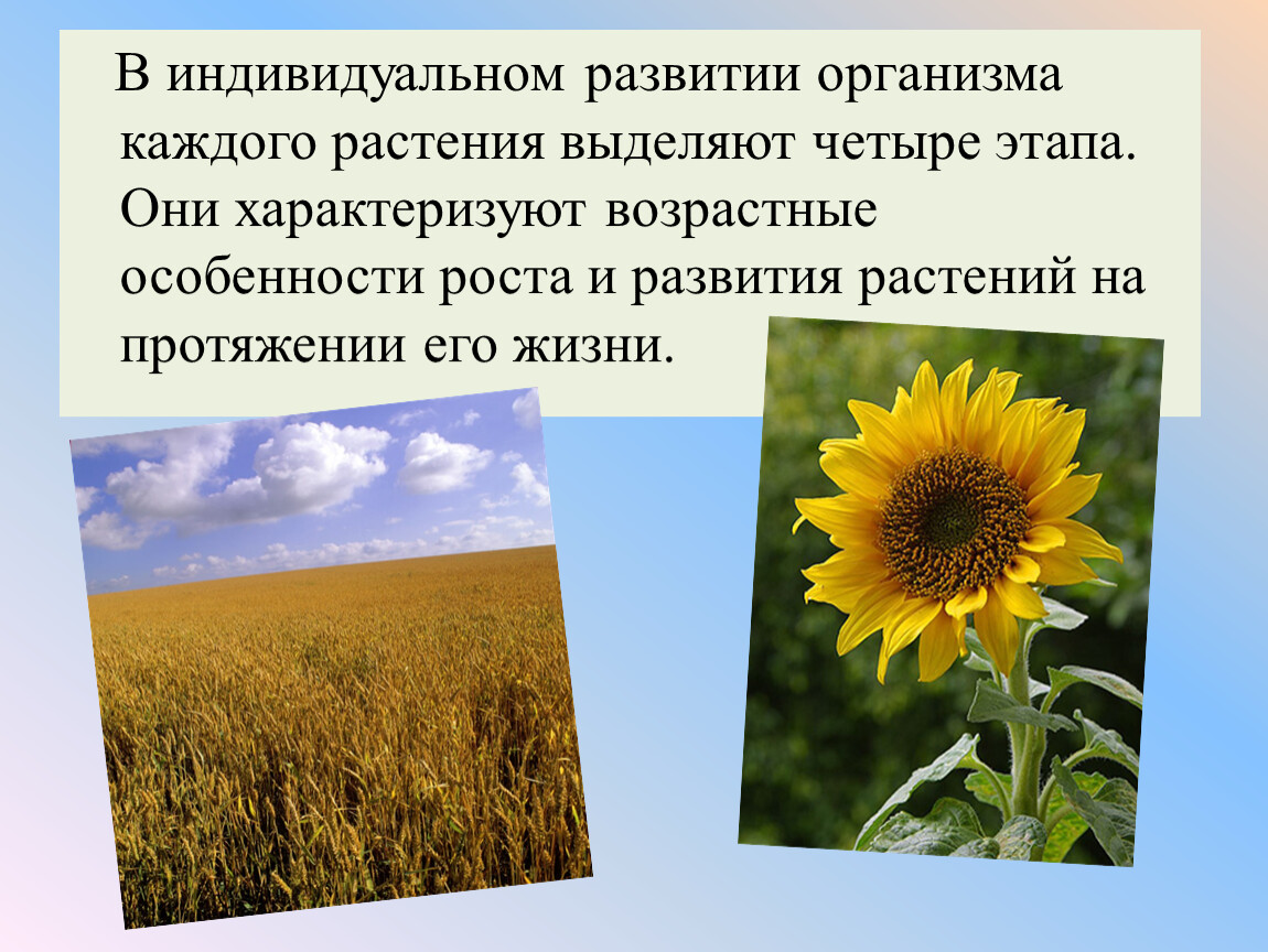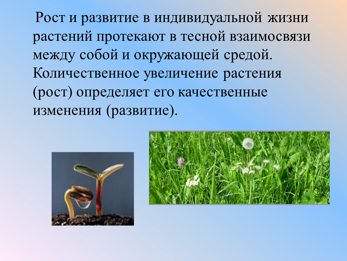 Рост и развитие в индивидуальной жизни растений протекают в тесной взаимосвязи между собой и окружающей средой. Количественное увеличение растения (рост) определяет его качественные изменения (развитие).