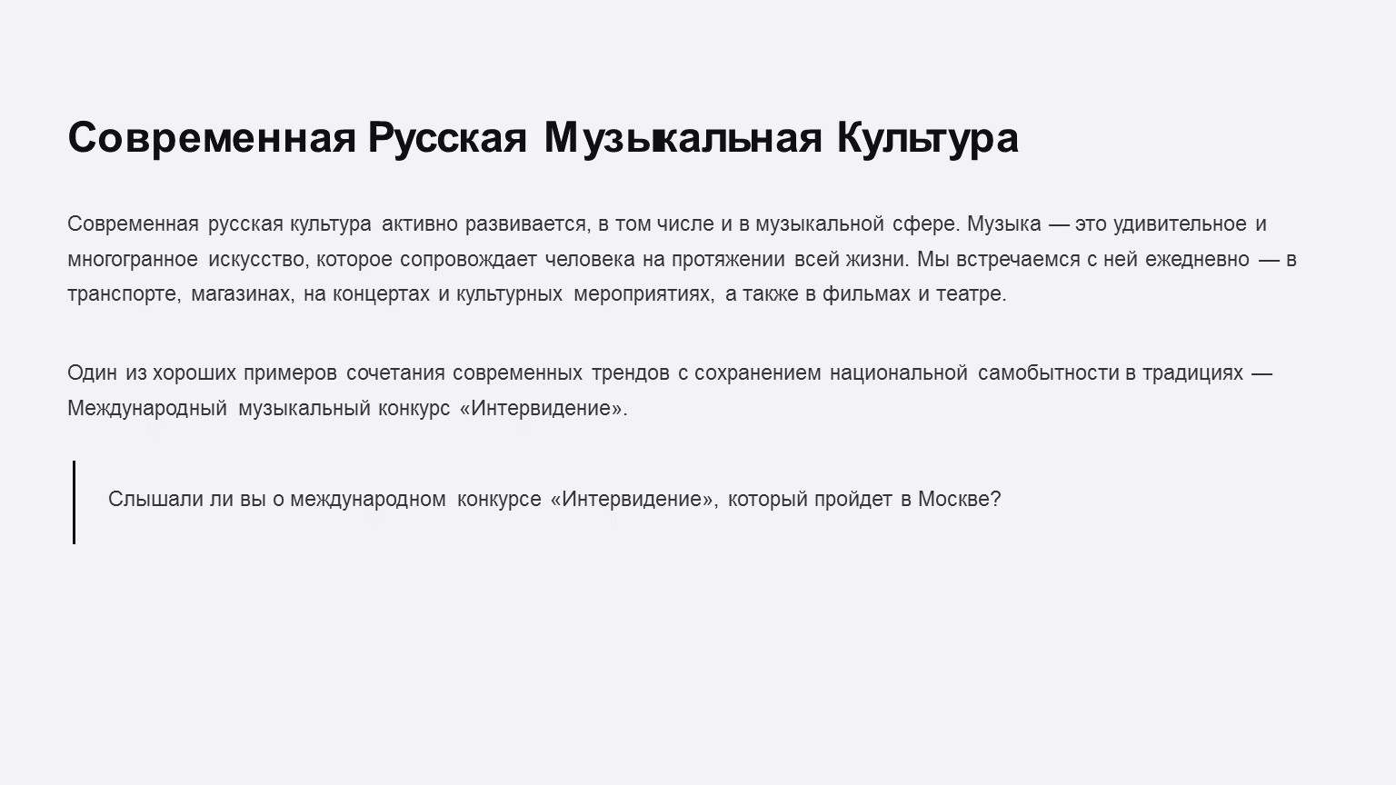 Современная русская культура активно развивается, в том числе и в музыкальной сфере. Музыка — это удивительное и многогранное искусство, которое сопровождает человека на протяжении всей жизни. Мы встречаемся с ней ежедневно — в транспорте, магазинах, на концертах и культурных мероприятиях, а также в фильмах и театре.