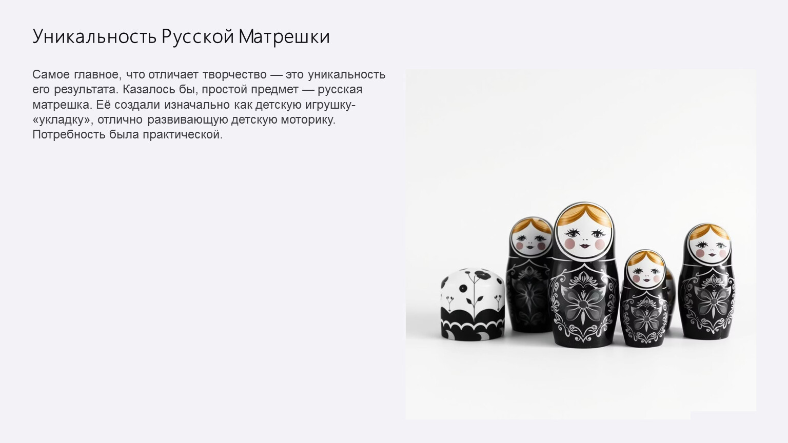 Самое главное, что отличает творчество — это уникальность его результата. Казалось бы, простой предмет — русская матрешка. Её создали изначально как детскую игрушку-«укладку», отлично развивающую детскую моторику. Потребность была практической.