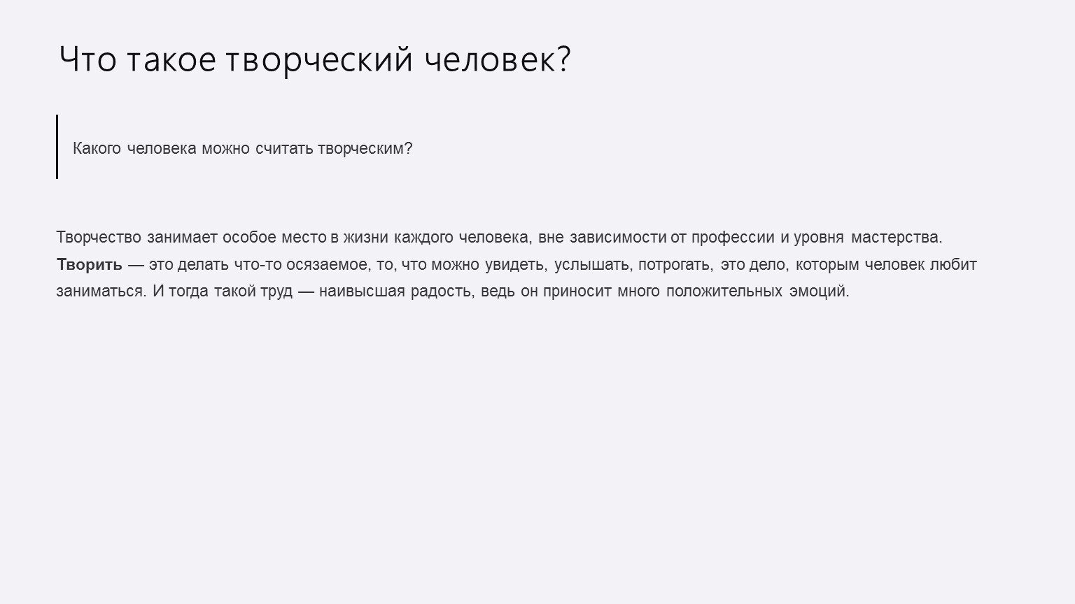 Творчество занимает особое место в жизни каждого человека, вне зависимости от профессии и уровня мастерства. Творить — это делать что-то осязаемое, то, что можно увидеть, услышать, потрогать, это дело, которым человек любит заниматься. И тогда такой труд — наивысшая радость, ведь он приносит много положительных эмоций.