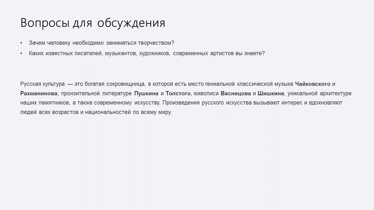 Русская культура — это богатая сокровищница, в которой есть место гениальной классической музыке Чайковского и Рахманинова, пронзительной литературе Пушкина и Толстого, живописи Васнецова и Шишкина, уникальной архитектуре наших памятников, а также современному искусству. Произведения русского искусства вызывают интерес и вдохновляют людей всех возрастов и национальностей по всему миру.