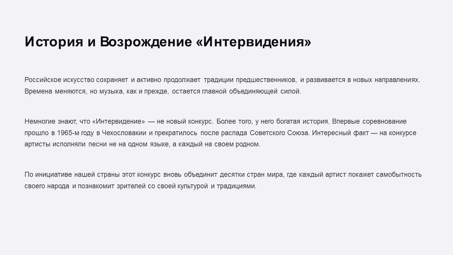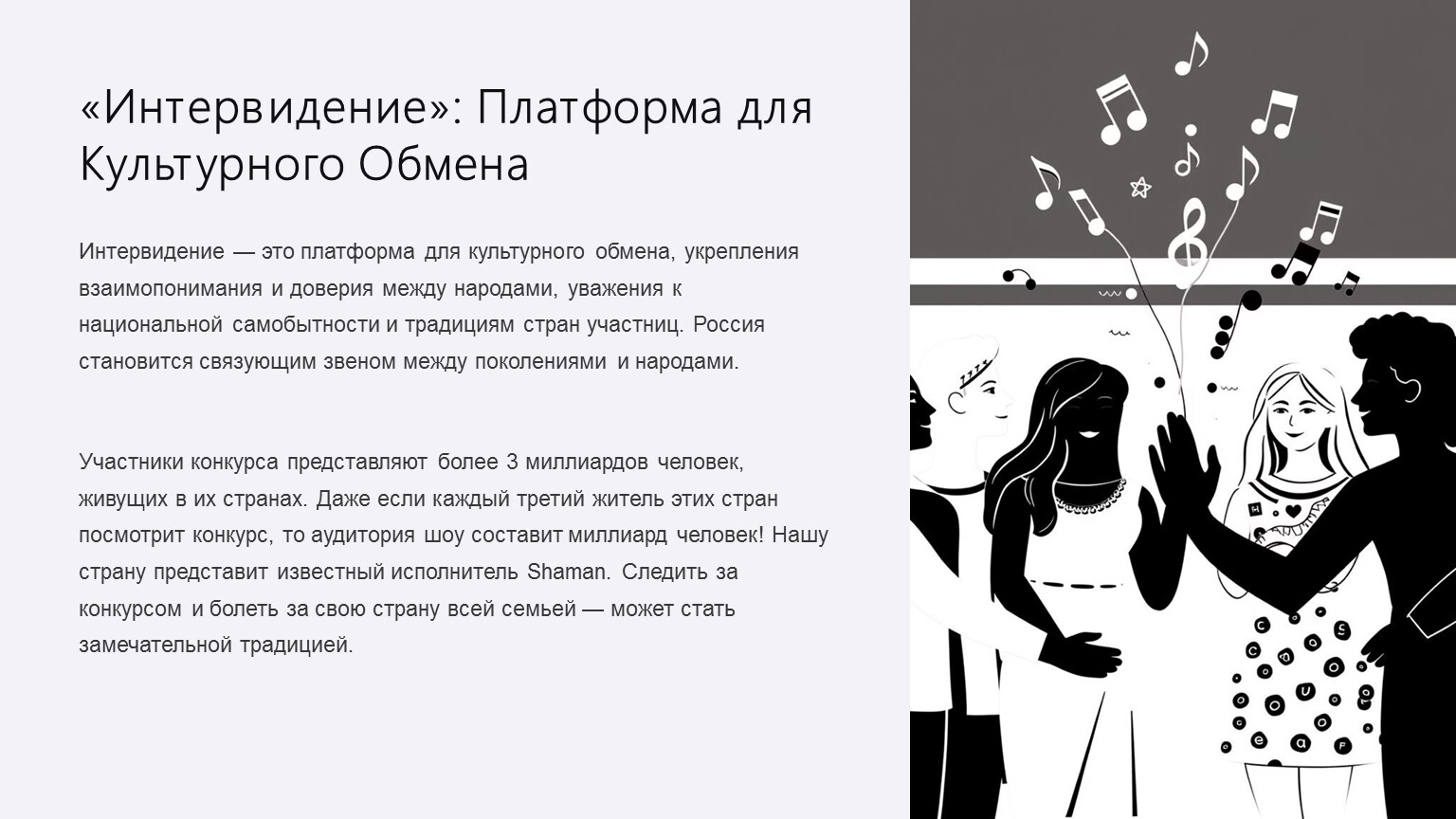 Интервидение — это платформа для культурного обмена, укрепления взаимопонимания и доверия между народами, уважения к национальной самобытности и традициям стран участниц. Россия становится связующим звеном между поколениями и народами.