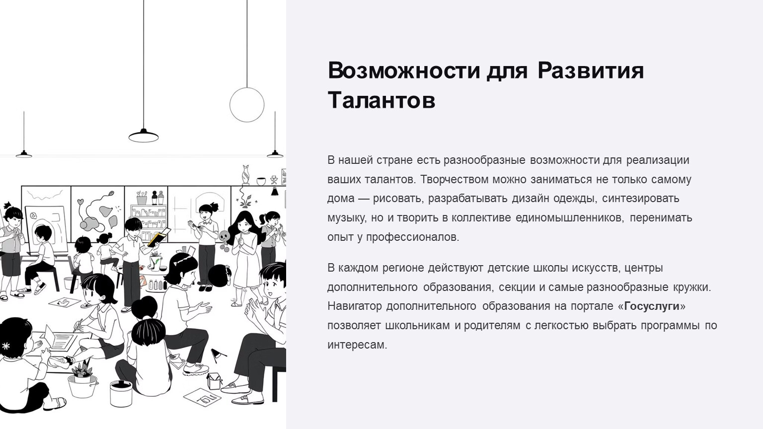 В каждом регионе действуют детские школы искусств, центры дополнительного образования, секции и самые разнообразные кружки. Навигатор дополнительного образования на портале «Госуслуги» позволяет школьникам и родителям с легкостью выбрать программы по интересам.