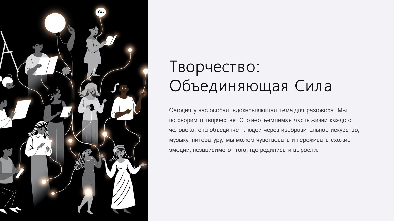 Сегодня у нас особая, вдохновляющая тема для разговора. Мы поговорим о творчестве. Это неотъемлемая часть жизни каждого человека, она объединяет людей через изобразительное искусство, музыку, литературу, мы можем чувствовать и переживать схожие эмоции, независимо от того, где родились и выросли.
