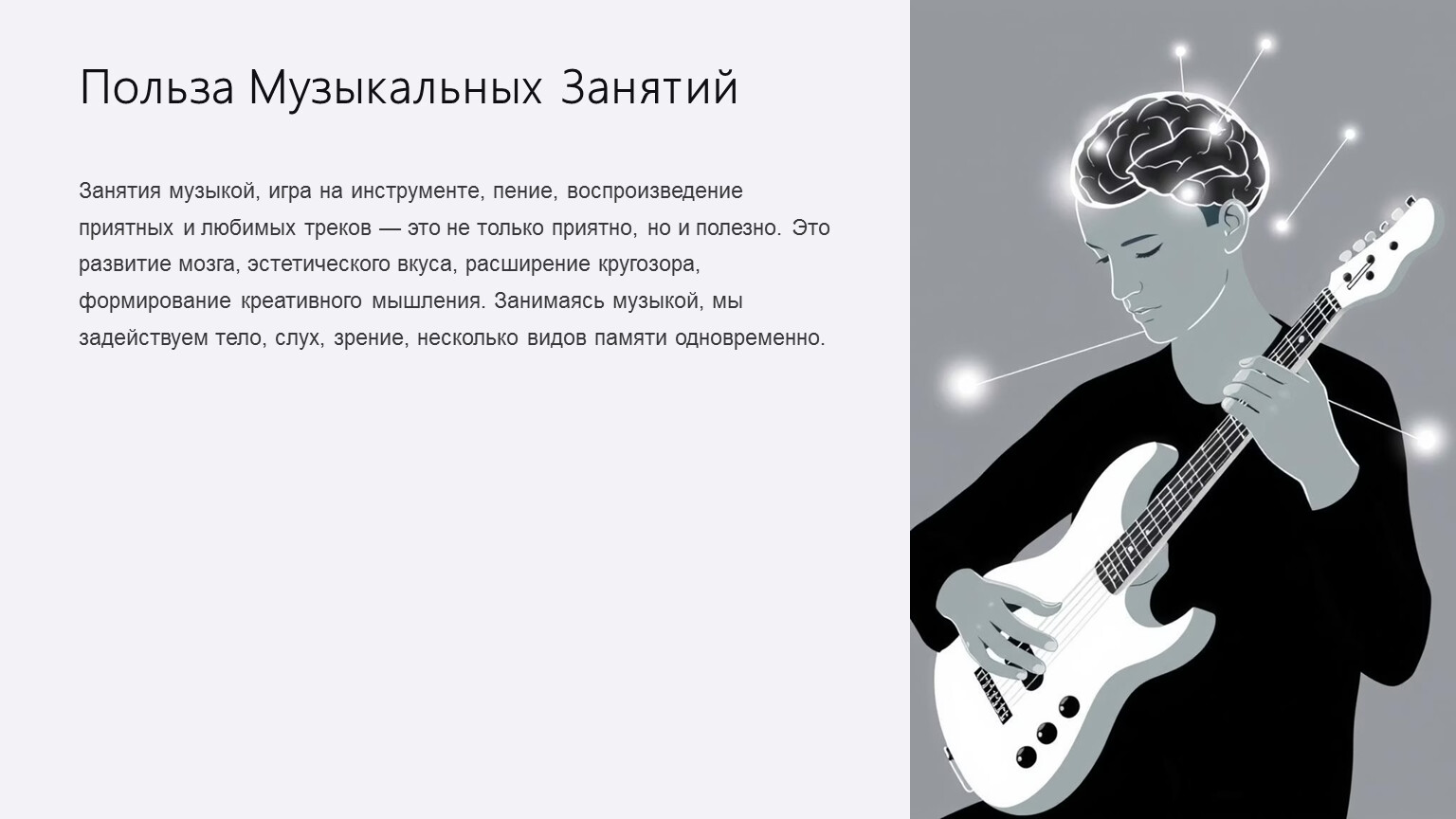 Занятия музыкой, игра на инструменте, пение, воспроизведение приятных и любимых треков — это не только приятно, но и полезно. Это развитие мозга, эстетического вкуса, расширение кругозора, формирование креативного мышления. Занимаясь музыкой, мы задействуем тело, слух, зрение, несколько видов памяти одновременно.