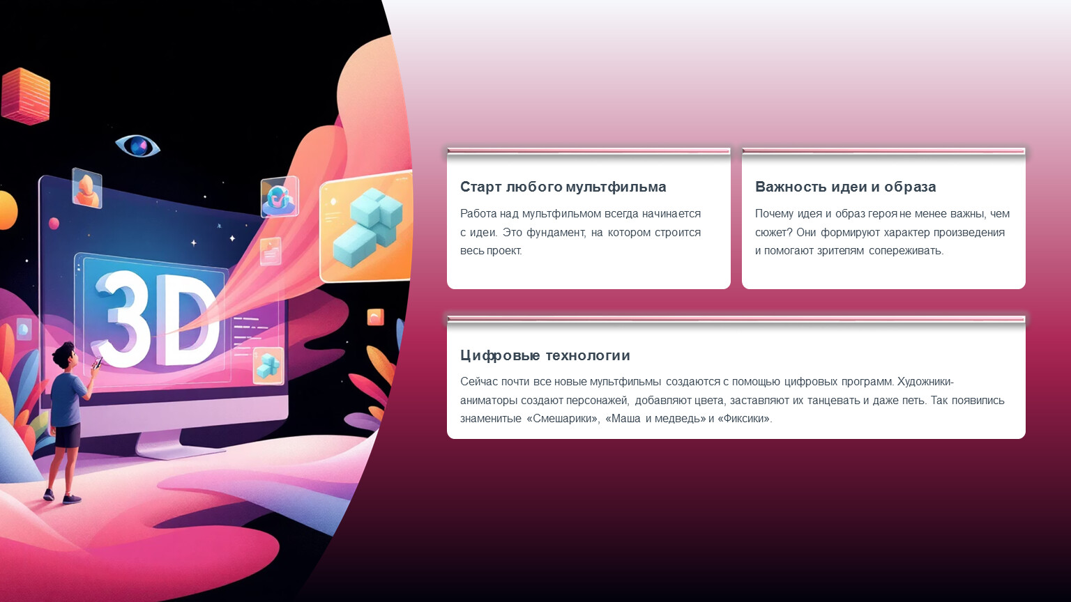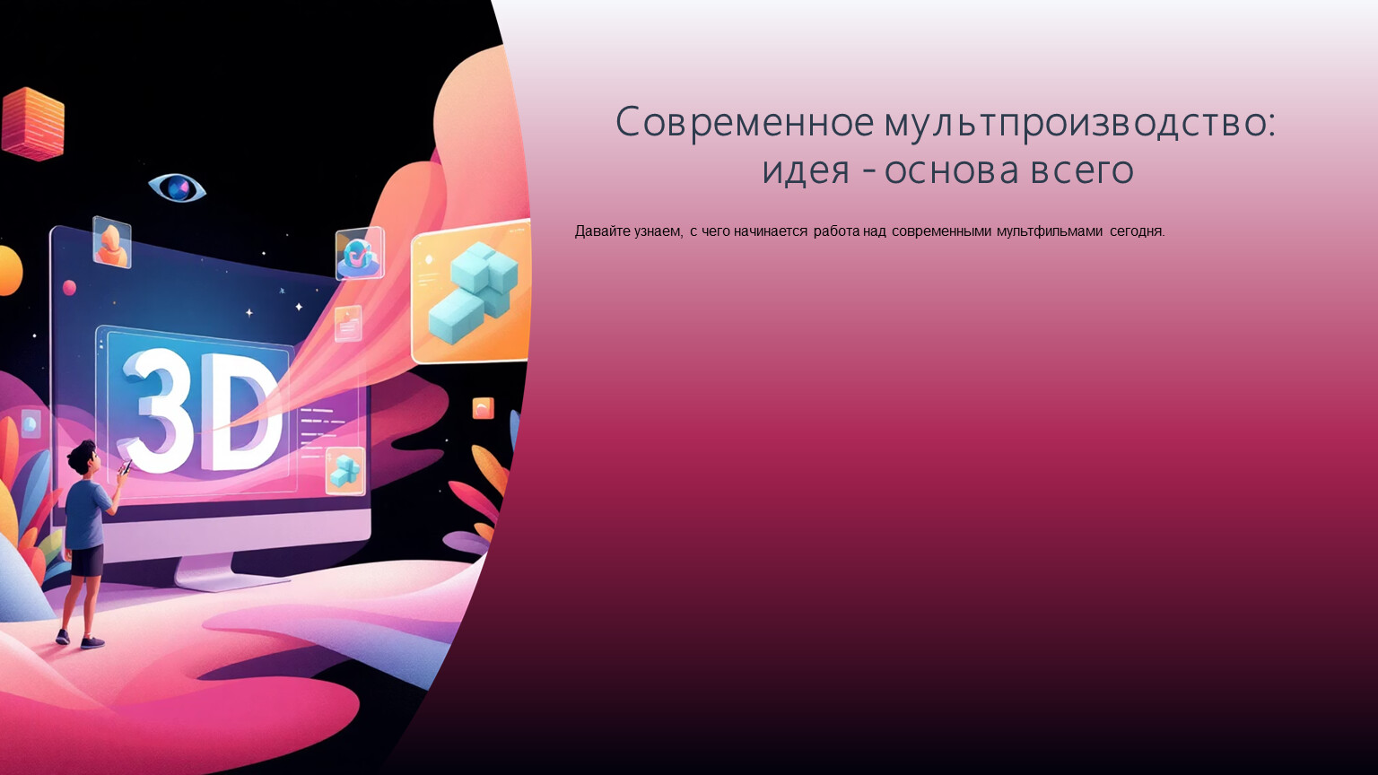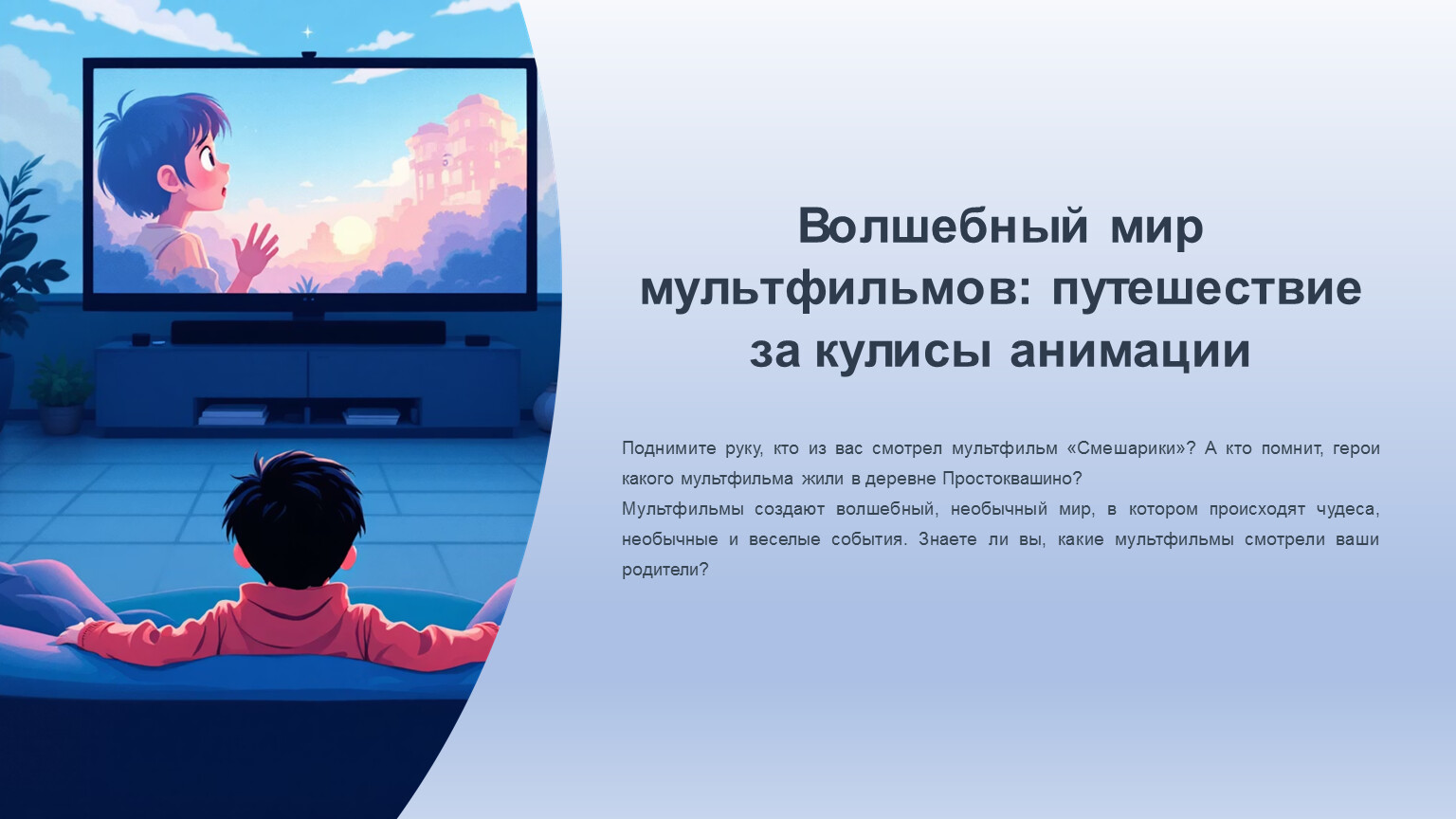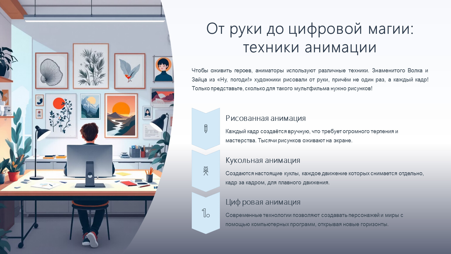 Каждое поколение растет в окружении добрых героев мультфильмов. А потом, когда люди вырастают, с теплом вспоминают истории и героев из детства. Задумывались ли вы когда-нибудь, как именно создаются мультфильмы? Кто придумывает героев, рисует, озвучивает их? Именно об этом мы сегодня и поговорим. Мы узнаем, какой путь проходит каждая история, чтобы стать ярким мультфильмом, который вы видите на экране. Ведь создание мультфильма — это настоящее искусство, труд многих талантливых людей.