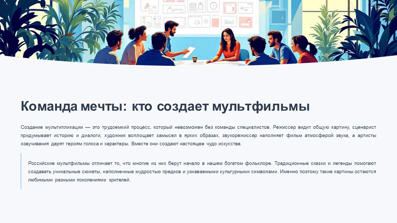 Создание мультипликации — это трудоемкий процесс, который невозможен без команды специалистов. Режиссер видит общую картину, сценарист придумывает историю и диалоги, художник воплощает замысел в ярких образах, звукорежиссер наполняет фильм атмосферой звука, а артисты озвучивания дарят героям голоса и характеры. Вместе они создают настоящее чудо искусства.