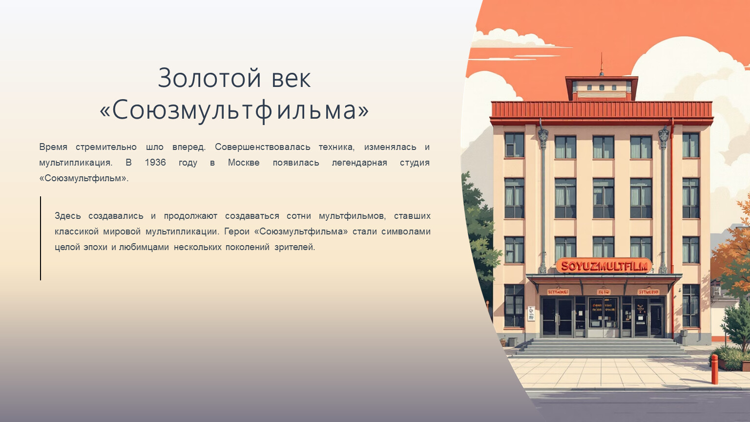 Время стремительно шло вперед. Совершенствовалась техника, изменялась и мультипликация. В 1936 году в Москве появилась легендарная студия «Союзмультфильм».