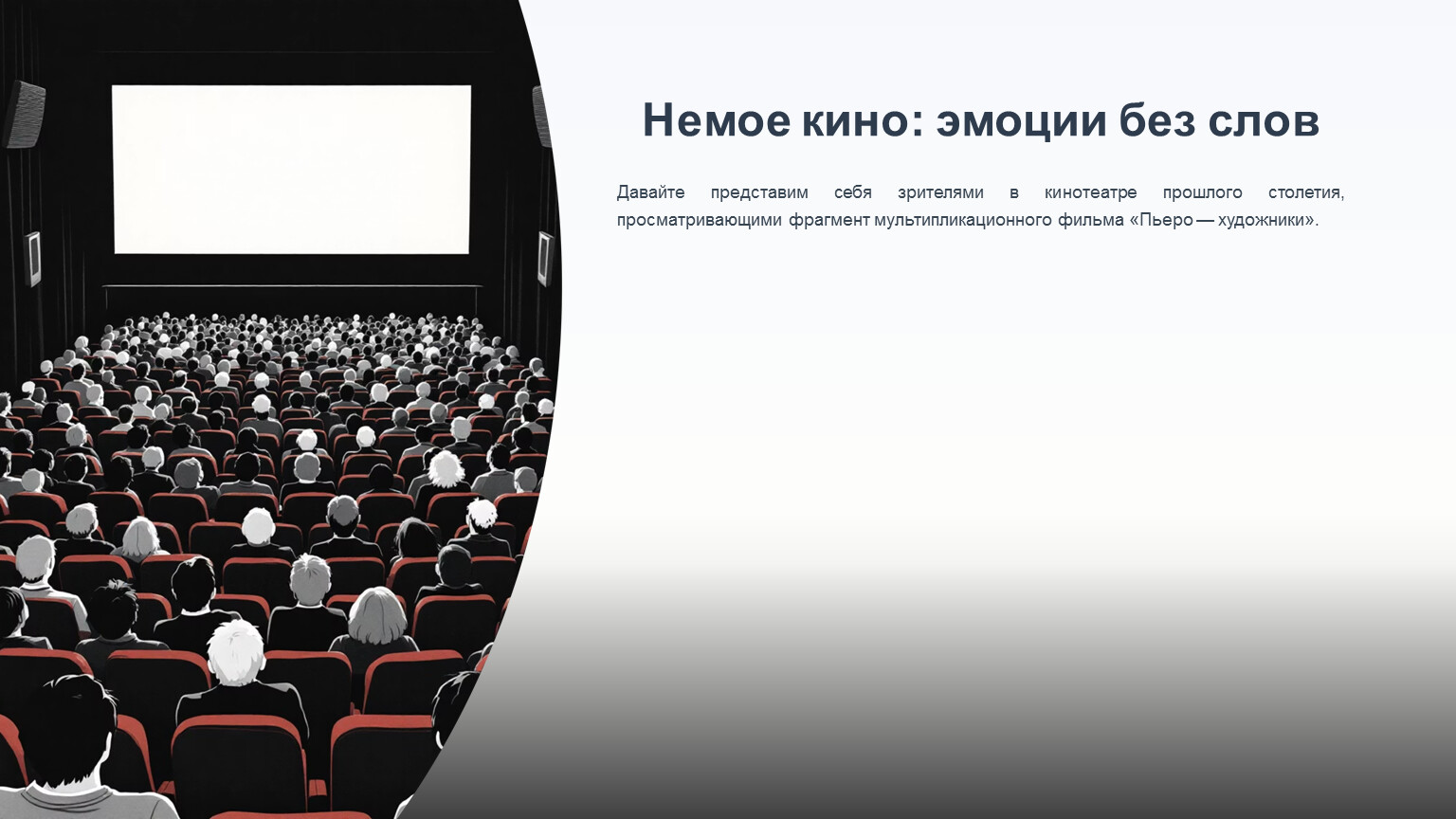 Давайте представим себя зрителями в кинотеатре прошлого столетия, просматривающими фрагмент мультипликационного фильма «Пьеро — художники».