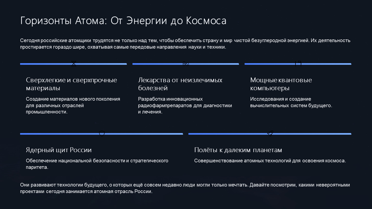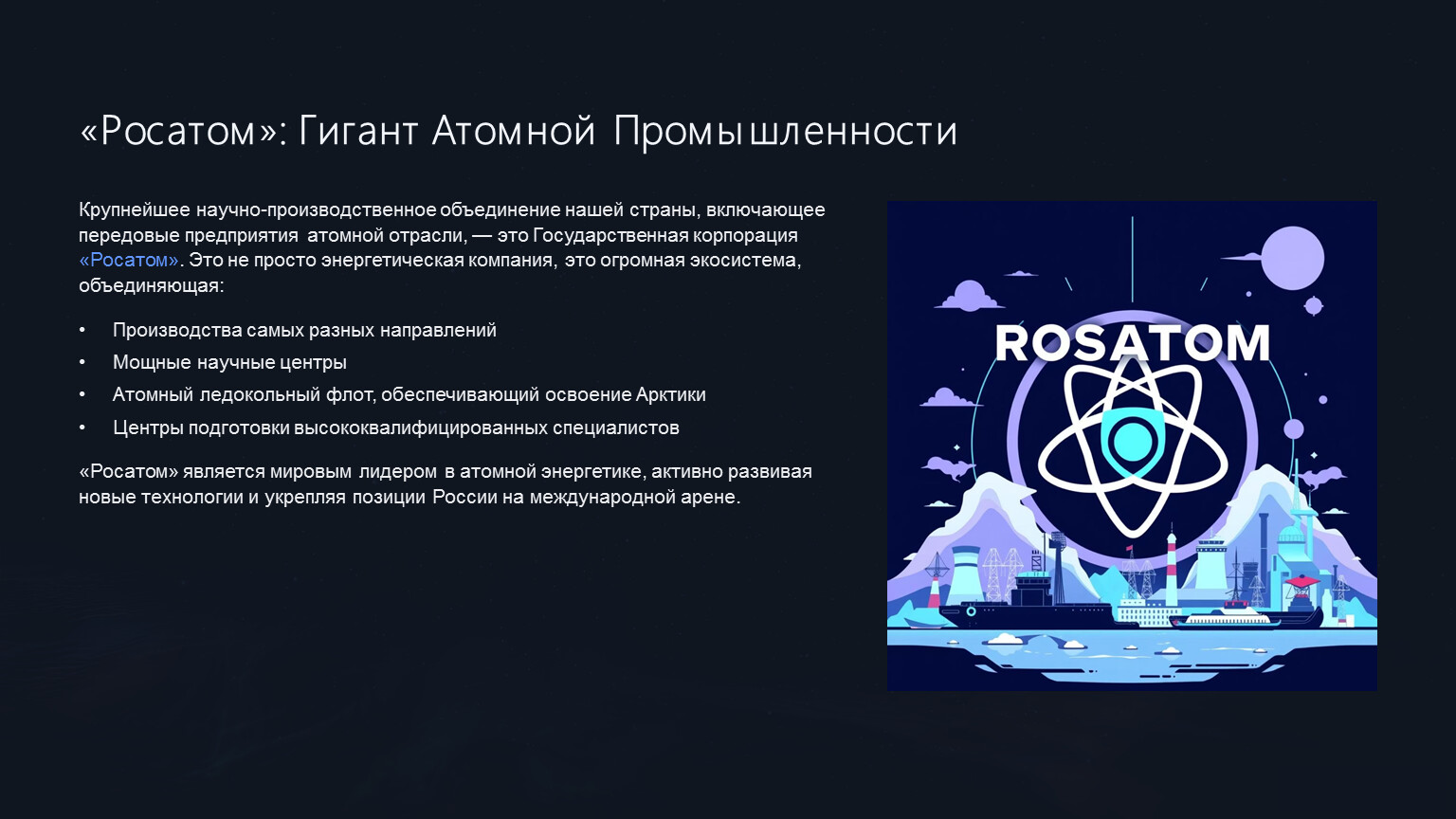 Россия по праву гордится своими достижениями в атомной отрасли. Атомные технологии меняют привычные представления о границах возможного, открывая новые горизонты для развития человечества. Эта презентация расскажет об уникальной роли атома в нашей жизни и о том, как российские атомщики строят будущее.