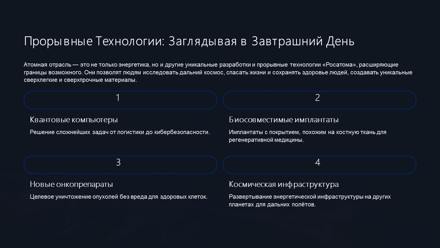 Атомная отрасль — это не только энергетика, но и другие уникальные разработки и прорывные технологии «Росатома», расширяющие границы возможного. Они позволят людям исследовать дальний космос, спасать жизни и сохранять здоровье людей, создавать уникальные сверхлегкие и сверхпрочные материалы.